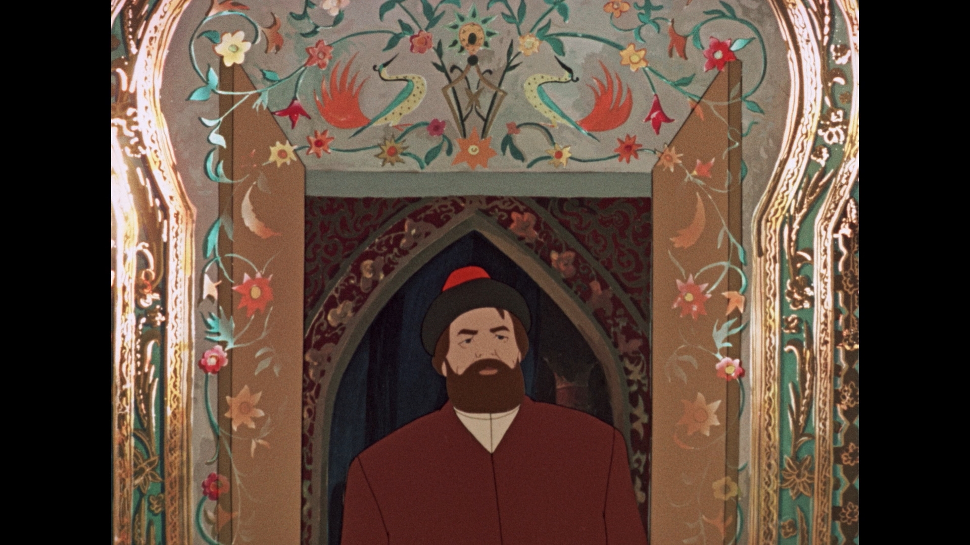 Also here is Atamanov's earlier, groundbreaking The Scarlet Flower from 1952, a 42-minute musical version of the Russian variant of "Beauty and the Beast." The gist is the same here as young Nastenka dreams of a beautiful scarlet flower and asks her traveling shipping merchant father to bring one back if he ever comes across it. Of course he does at a remote castle owned by a towering beast who offers to swap the flower for Nastenka. Interestingly, the film's human characters are almost entirely rotoscoped -- a technique used sparingly by Disney but later employed extensively by Ralph Bakshi, whose characters look a lot like these. Given its length, this was usually released on home video or shown theatrically with other films, often as part of a fairy tale series; no matter how you see it, this is quite the enchanting and effective rendering with a very Russian flavor. Again the restoration of the original Russian-language version, immaculately restored and featuring a commentary by Giesen outlining the "eclair" process of using live actors to adapt to animation, the desire to make a truly national form of artistic entertainment, and the Russian literary source with its tweaks to the more familiar French-based one we all know.