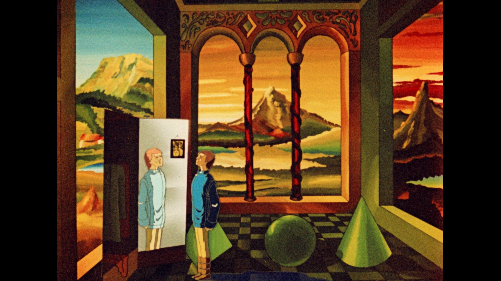 daydreams or memories focused around childhood and floating in space. Eventually a novel yet simple solution seems to present itself. Very much in keeping with the tone of David Bowie's Major Tom cycle, this is a beautiful and hypnotic vignette. Running much longer at half an hour is Tarasov's The Pass from 1988, written by Kir Bulychov from a portion of his novel The Settlement. Essentially it's a snapshot in the existence of survivors of a spaceship crash who are now stranded on a harsh planet inhabited by alien lifeforms. The young of them, Oleg, was a baby when they arrived, and now they live far from the crash site. When a trip back to the ship is necessary, Oleg and three others make the trek by foot and reconnect with their earthly existence while finding a renewed sense of purpose. The animation here is moody and beautiful with wild shades of yellow and red, including a spellbinding storytelling sequence around candlelight, and the environment is give a great deal of attention and detail that would put many feature-length films to shame. Specs are the same here, and the same trio return for an audio commentary covering comparisons to the source novel (which has more of a split narrative), the beautiful nuances of the animation and use of color, the unorthodox score choices, and ties to the rest of his work. Chester is also back with another video essay, "Vladimir Tarasov" (17m20s), featuring extensive coverage about his many short films, his amusing appropriation of familiar cartoon characters, the adoption of jazz and familiar soundtrack music in his films, and Bulyachov's issues with the end