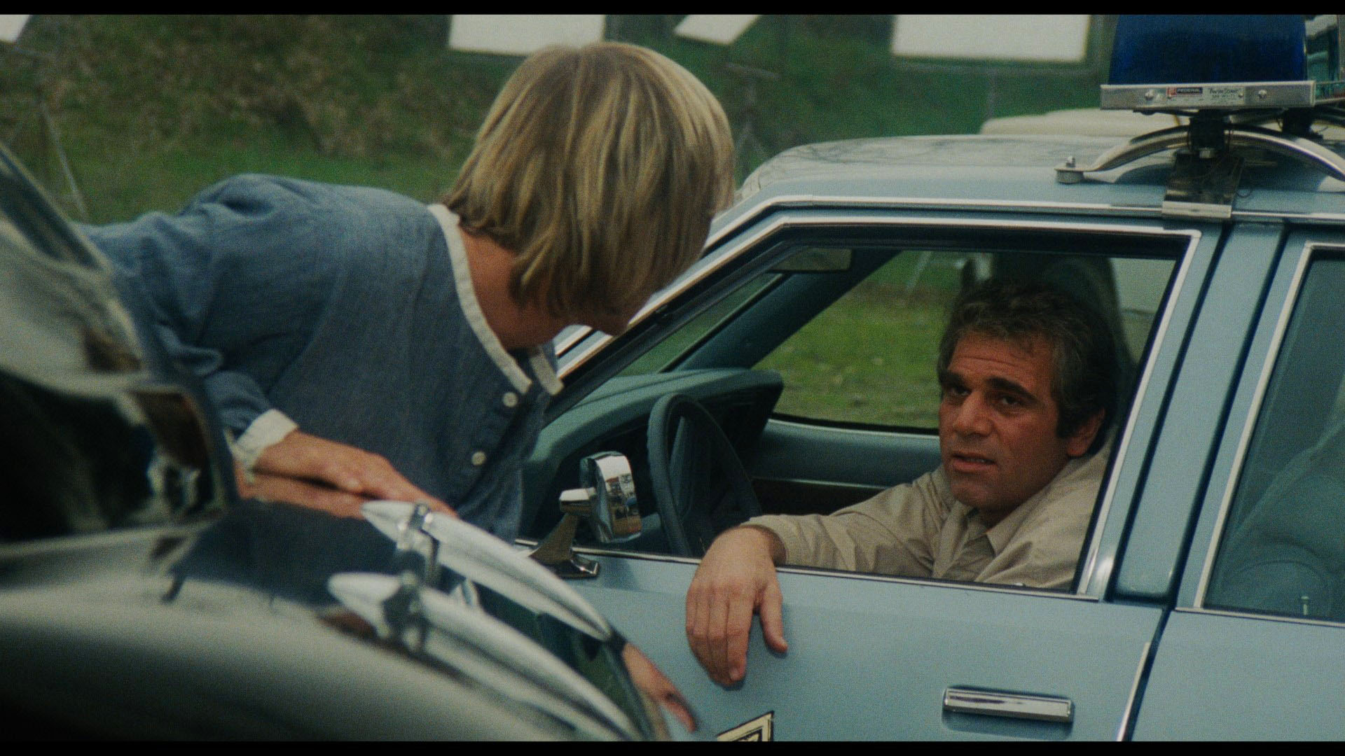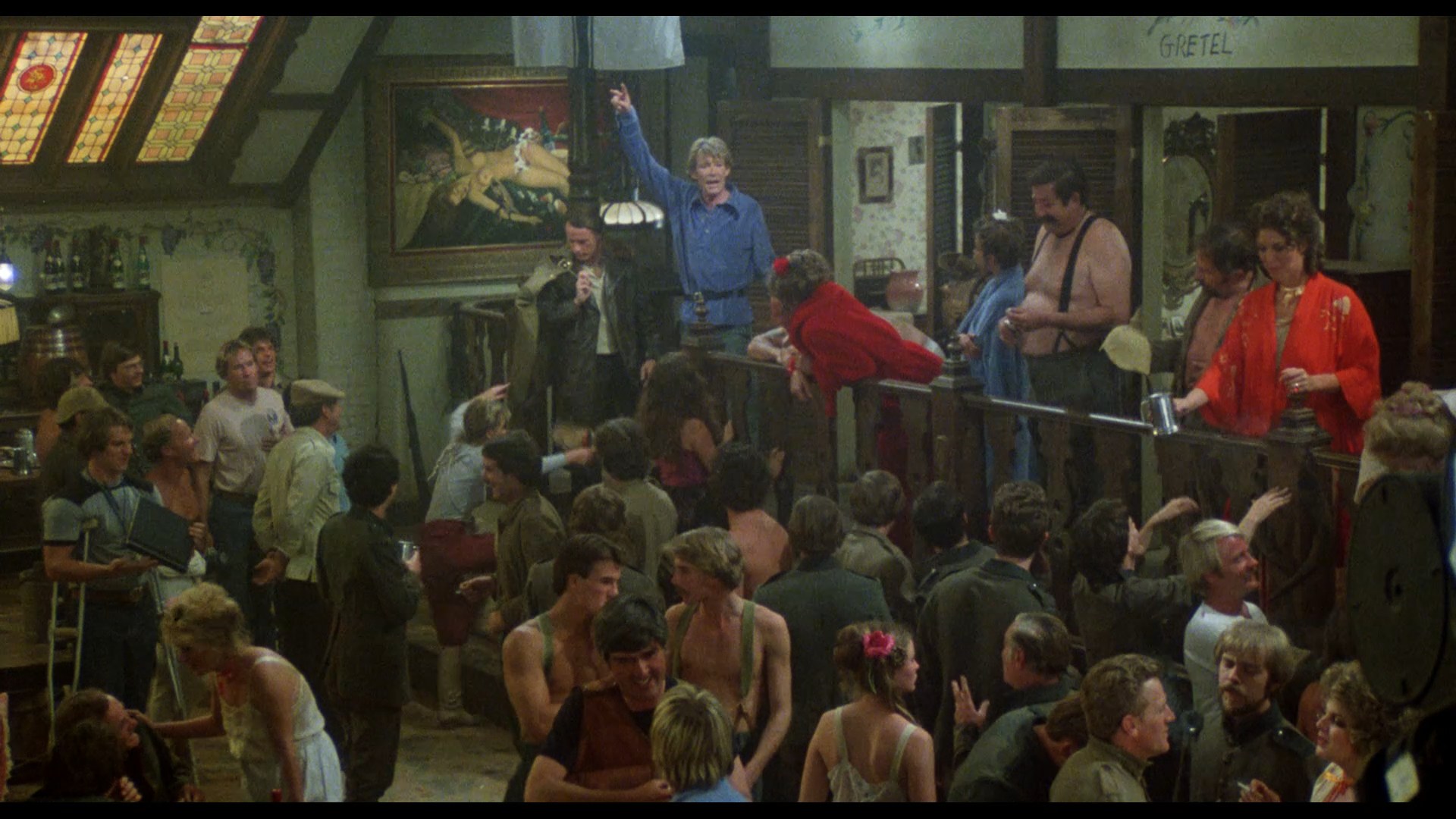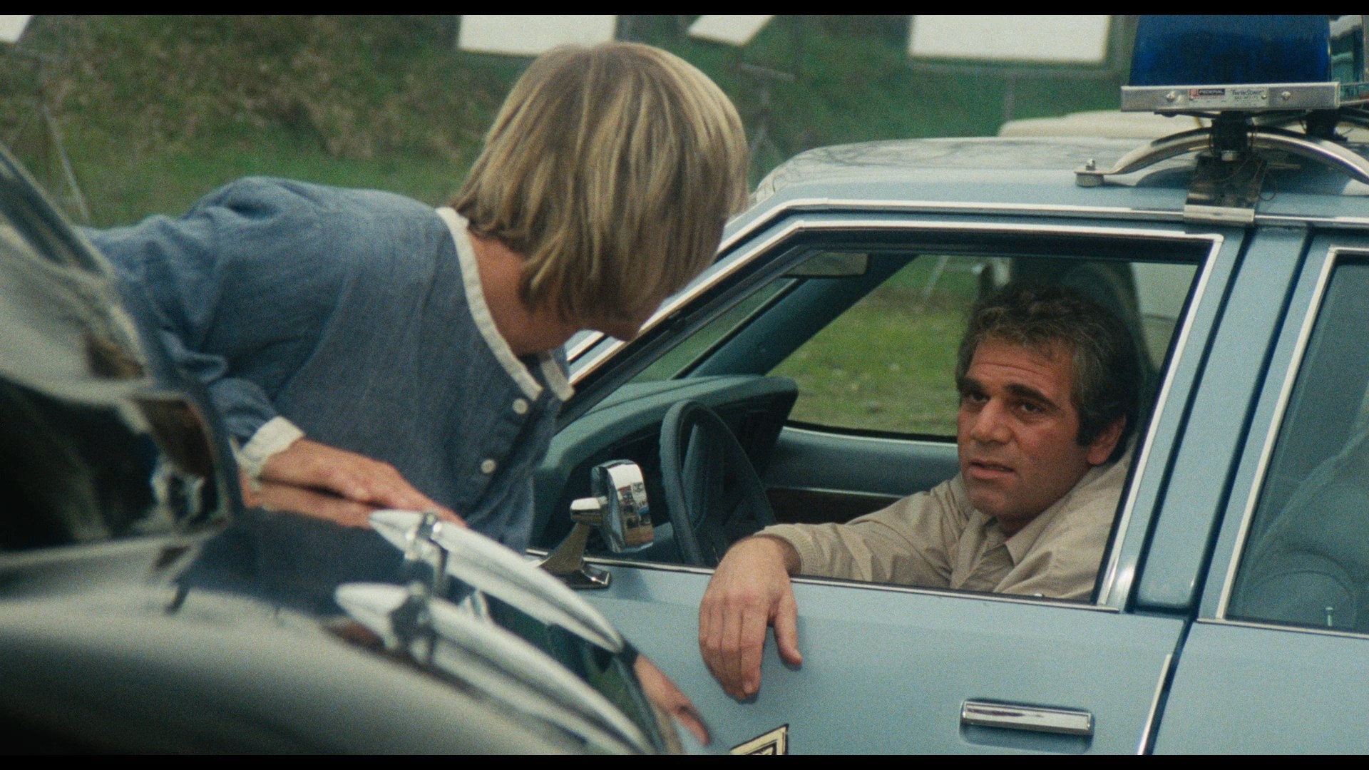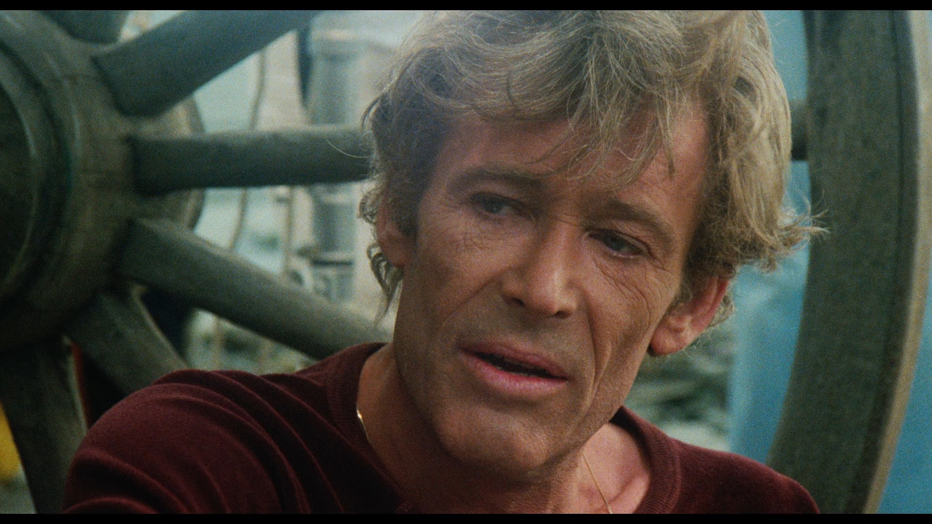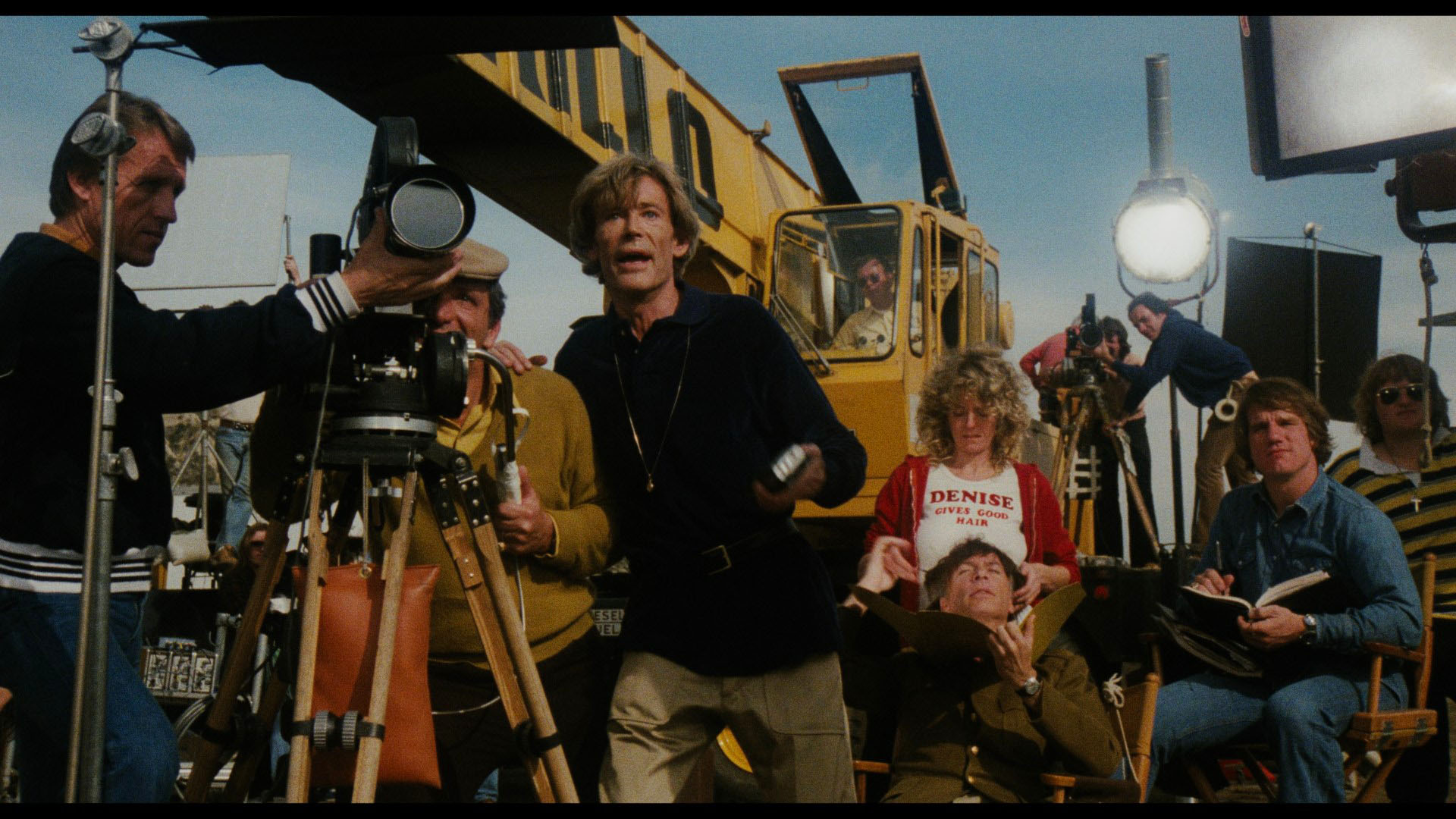 In 2026, Radiance Films sleeted The Stunt Man as the second release in its Transmission brand (following another 1980 film, Night of the Juggler) as an expanded UHD and Blu-ray region-free special edition. The new 4K scan from the original camera negative looks superb, retaining the inherent grittiness of the original cinematography while increasing detail and color fidelity with the UHD's HDR-compatible Dolby Vision grade looking especially rich. It also features a major amount of significant image info in the second half of the film, which was cropped to varying degrees in earlier releases (see comparison below). The DTS-HD MA 2.0 mono and 5.1 options both sound solid and come with optional English SDH subtitles. Ported over here are the original cast and crew commentary, Rush's intro, The Sinister Saga, the Rush intro, the New Beverly Q&A, the trailer, the deleted scenes, and the prior Blu-ray's Rush, O'Toole, Railsback-Rocco, and Hershey interviews. (It's a little jarring now to note that only two of them are still with us as of this writing.) A new audio commentary with critics Christina Newland and Monica Castillo does an enthusiastic job of parsing through the film's reality vs. illusion theme, the treatment of war trauma, the role of the score, the depictions of tyrannical film directors, and much more. Also new here is an interview with Bail (10m6s), shot before his death in 2020 for a documentary about Rush, chatting about his career as a stunt man, his memories of Rush and working in San Diego, and the working process of essentially playing himself as well as his favorite moments in the final result. The limited edition also comes with a pull-out poster, six lobby-card style postcards, and a 40-page book with new essays by Adam Nayman and Brandon Streussnig and an archival interview with Rush and Kenneth Turan.