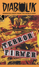Following its Terror Firmertheatrical run including numerous midnight screenings, Terror Firmer has been on home video in numerous formats including a special edition DVD in 2001. The double-disc set features an open matte, interlaced presentation of the complete unrated version, a 1m27s Kaufman intro about the role of James Gunn in creating this film, three commentaries (Kaufman solo, editors Gabe Terror FirmerFriedman and Sean McGrath, and Keenan, Rochon, and Haaga), a 16m14s "Fun with Scissors" section of twelve deleted scenes with optional editor commentary, eleven alternate footage scenes, an escalator scene comic-to-film comparison, a 6m27s cast audition reel, a 6m13s blooper reel, and a trailer and teaser. If you feel so inclined, you can also watch the film with the deleted scenes put back in (running 123m59s with the editors' commentary if you want it) which is a very bumpy watching experience. The second DVD features the massive "Farts of Darkness" making-of documentary (99m23s), a Lunachicks "Say What You Mean" music video, DJ Polo's "Freak of the Week" music video with Ron Jeremy (which needless to say doesn't play well now), Emtombed's "Seeing Red" music video, plugs for the soundtrack and the Troma book, a "Celebrate Tromadance!" promo, "Gyno-talk with Alyce LaTourelle," "At Home with Charlotte Kaufman," a Windows interactive game, the usual Terror FirmerRadiation March thing, and bonus trailers for Citizen Toxie, Unspeakable, Cannibal! The Musical, and Parts of the Family.