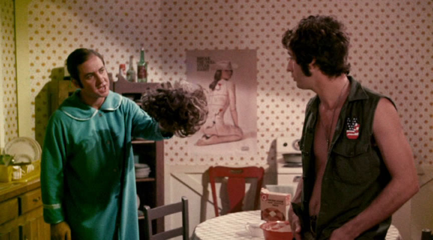 In a bright and cheerful suburban neighborhood, Stanley (character actor Crawford, hiding out under the name "Scott Lawrence") is a musclebound hippie type living with his dowdy aunt, Martha. However, despite the fact that auntie should be setting off warning bells in every single person who crosses her path, no one seems to catch on that she's actually Paul (Zwick), Stanley's partner in crime. As it turns out, they're both laying low after a robbery that led to an impromptu murder via butcher knife, and both of them seem to have some pretty serious personal issues that might blow their cover at any moment. For example, Stanley's prone to cruising around and picking up easy girls for a quick roll in the hay, only to cry out for Paul to come bail him out when the trysts turn sour. Even worse, Paul has a penchant for whipping out a butcher knife and going berserk at the slightest provocation. Stanley's lust for freedom doesn't sit well with his buddy, and their extreme co-dependence (which even extends to sleeping in the same bed) soon reaches a murderous fever pitch involving a hippie van, some cops, a couple of additional murders, and a frenzied climax on a local movie set.