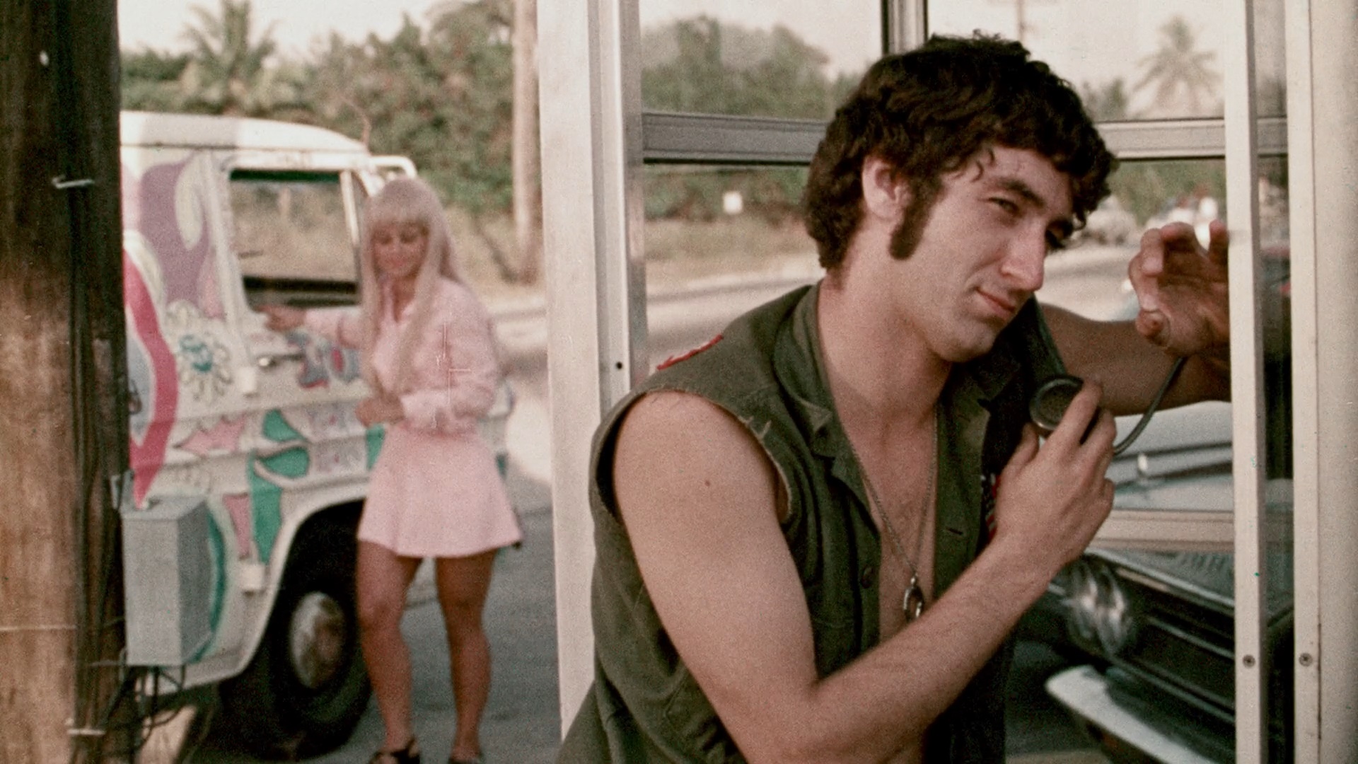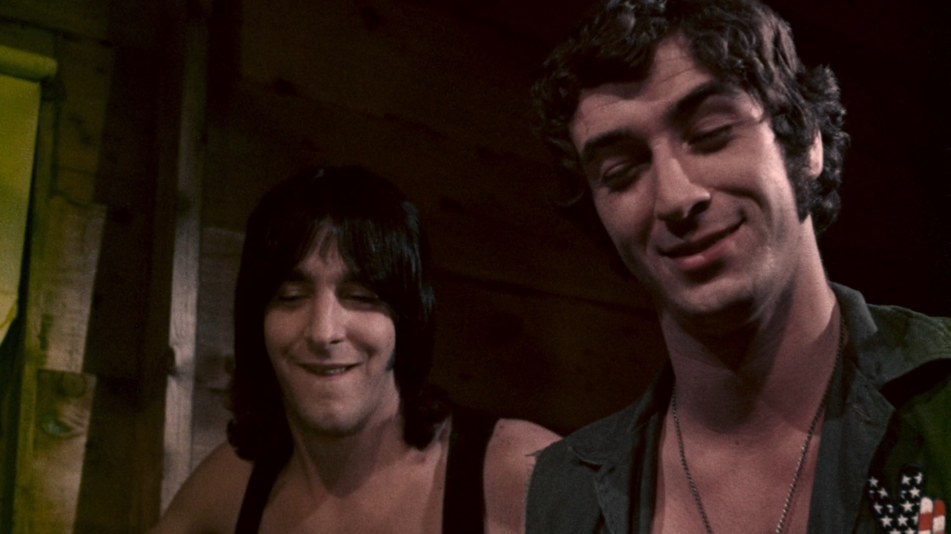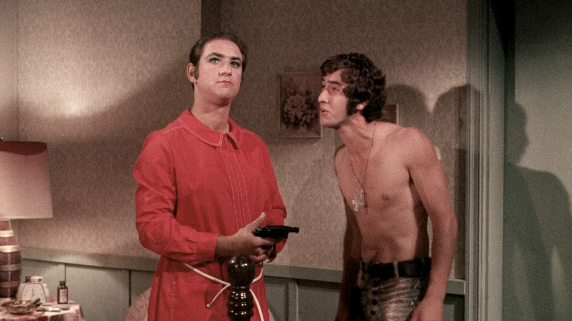 In 2020, AGFA went solo for a Blu-ray edition of the film taken from the same scan, so color timing and framing are the same. You do get a nice uptick in detail though, a given since it's gone from SD to 1080p, with little things like hair and clothing textures getting a visible bump. The DTS-HD MA English mono track is also fine considering it's from a print and doesn't have any significant issues. Here the earlier commentary is replaced with a new one featuring film historian and Ask Any Buddy creator Evan Purchell conversing with AGFA's Bret Berg about the film in context with the times; since there isn't a ton of background info available on this one, it's mainly about culling through the tidbits out there about Casey, films shooting in Florida around the time, and relevant queer-centric titles from the early '70s. Also among the "Histrionic Extras" are four video treats culled from the Something Weird archives starting off with "The Drag Queen's Ball" (47m38s), a lengthy document of a Tennessee drag pageant ("at Holiday Inn Dinner Theatre - Memphis Cotton Festival 1970 All-Male Cabaret Review") from preparation through performance complete with some familiar show tunes, bad jokes, and lots and lots of wigs and headdresses. Then the Gay Liberation Front's "Gay-In III" (9m54s) features casual interview footage with attendees at an LGBT festival complete with music performances and plenty of opinions about the current state of the world. "Caught in the Can" features the first seven minutes of a softcore quickie (also seen in a 25-minute condensation on Something Weird's DVD of A Scream in the Streets, though the original version runs a stultifying 65 minutes) with smut movie staples Ron Darby and Gerard Broulard dressing up in drag to pose as hookers only to get busted and thrown in the slammer with female inmates for some hanky panky. Finally an "Early Queer Film Trailers" reel (14m13s) features the wild coming attractions for Lusting Hours, My Third Wife George, Sins of Rachel, The Queen, and Gay Liberation.