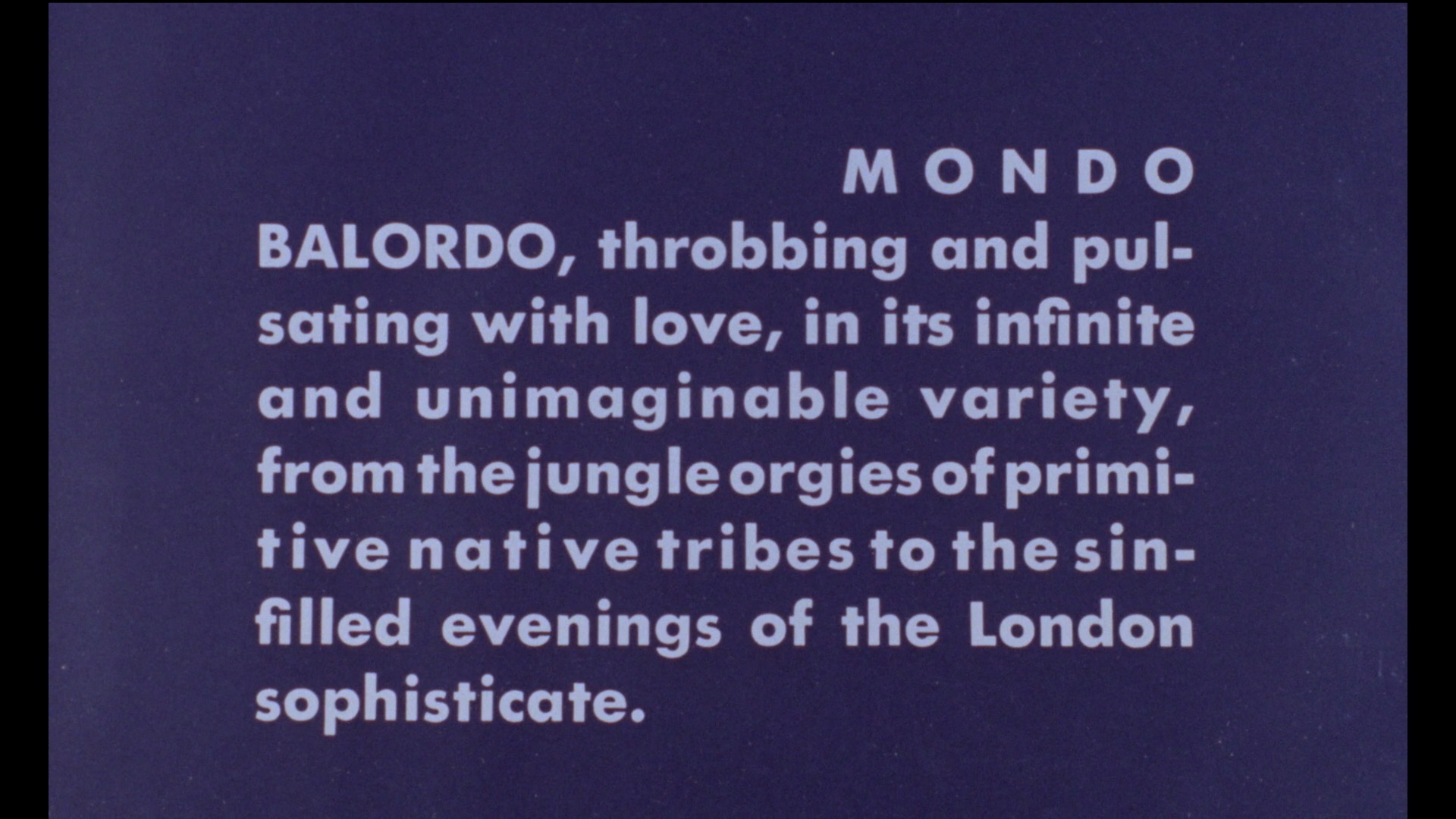 scan that's in very good shape and is letterboxed at 1.66:1. Obviously the film itself is something of a hodgepodge footage-wise (the African bits in particular look pretty rough and were likely stock footage shot far earlier), but the bulk of it looks very good and accurately reflects the patchwork nature involved despite some fading over the years. The DTS-HD MA English mono track sounds fine and about the same as we've heard it before. A theatrical trailer is included, but you also get a second bonus feature, 1960's The Orientals. An early Italian proto-mondo film that predates the genuine article by a couple of years with its narrated attempts to present this as real, this one's been around from Something Weird on VHS and DVD-R for about a decade and is taken here from what appears to be a full frame 16mm print (obviously cropped down from the scope original that barely played theaters). Essentially a string of tableaux about the treatment of women around the East, the whole thing is clearly staged and fictitious with drugs, crime, and polygamy getting the spotlight from Thailand to Nepal to to Egypt to Japan (including a glimpse at a young Akiko Wakabayashi and some sumo wrestling way before You Only Live Twice). Given that the earlier standalone version is long out of circulation, this extra feature is a welcome curio to have with that "SWV" bug in the corner finally gone.