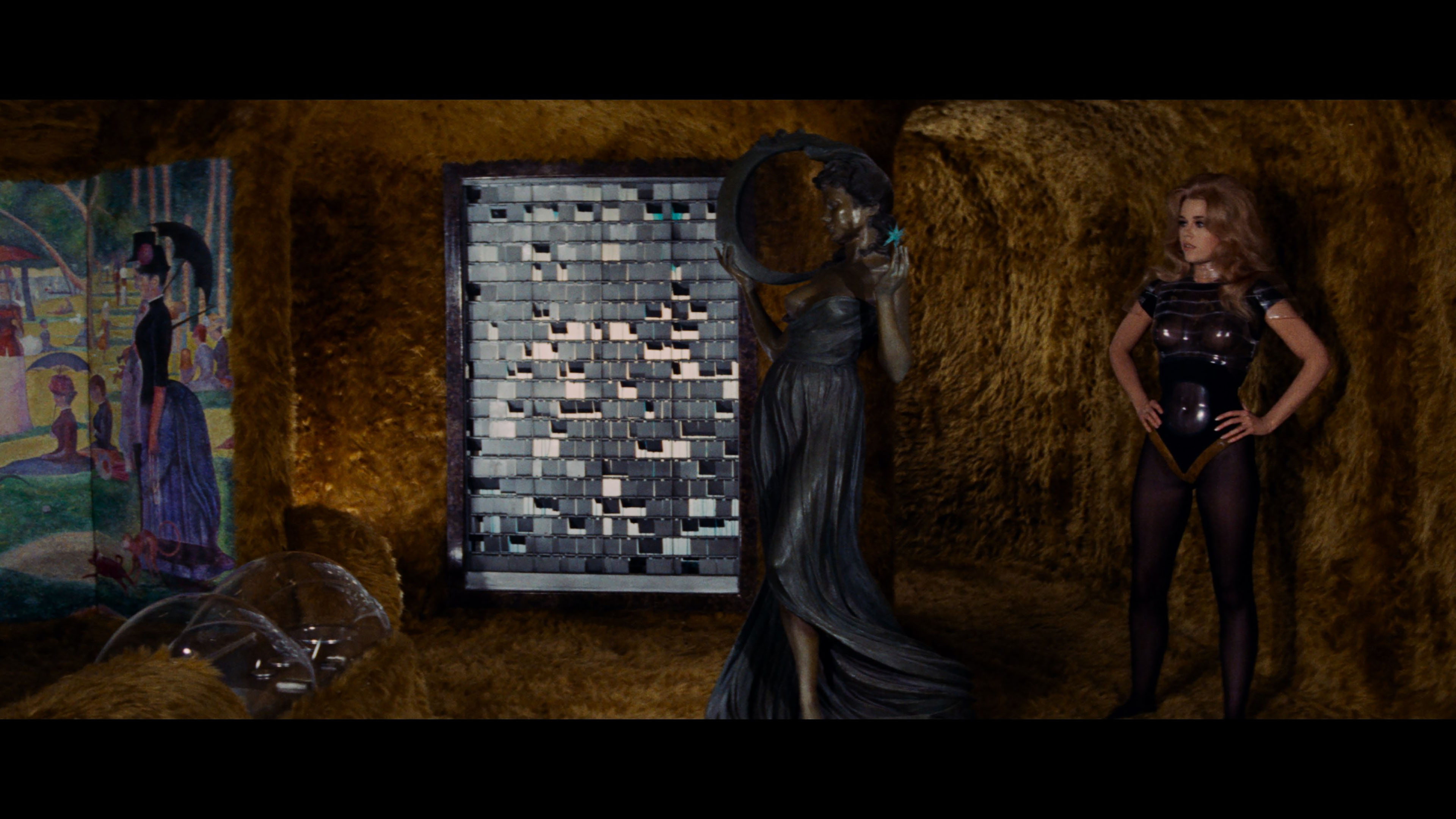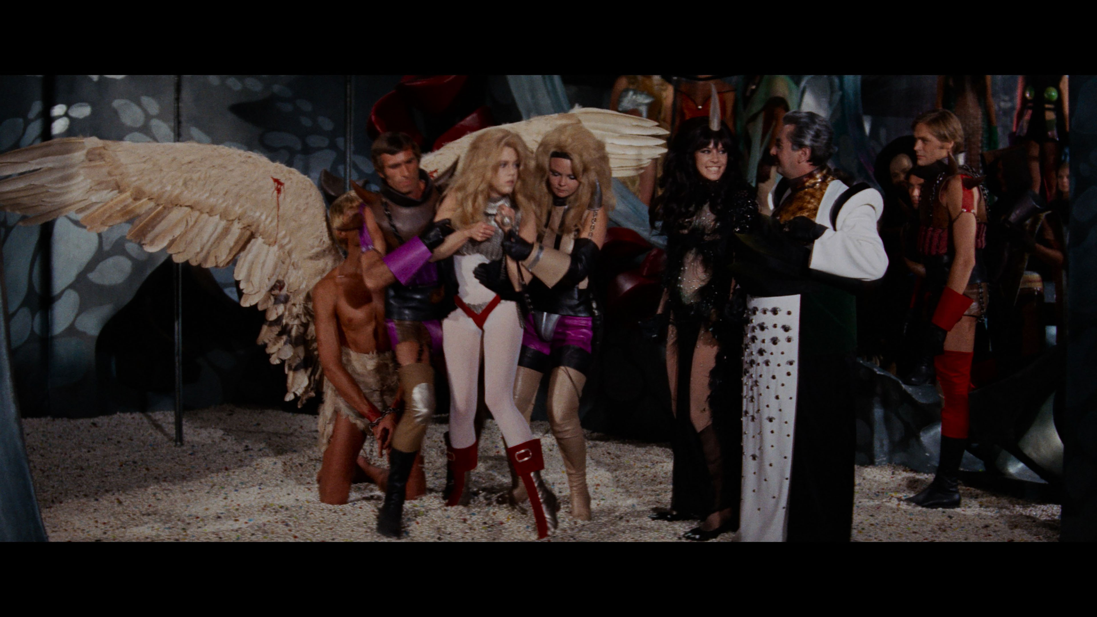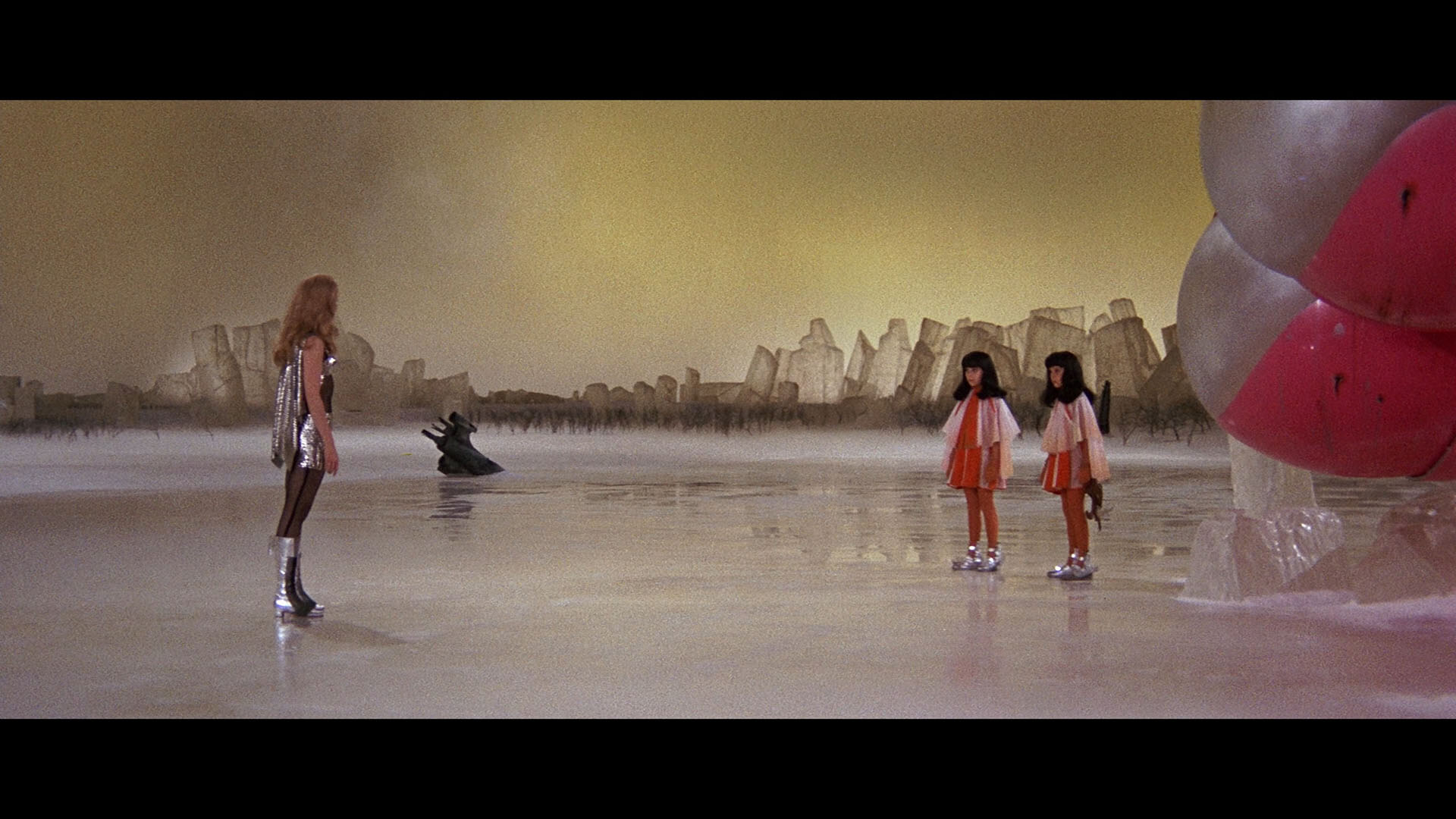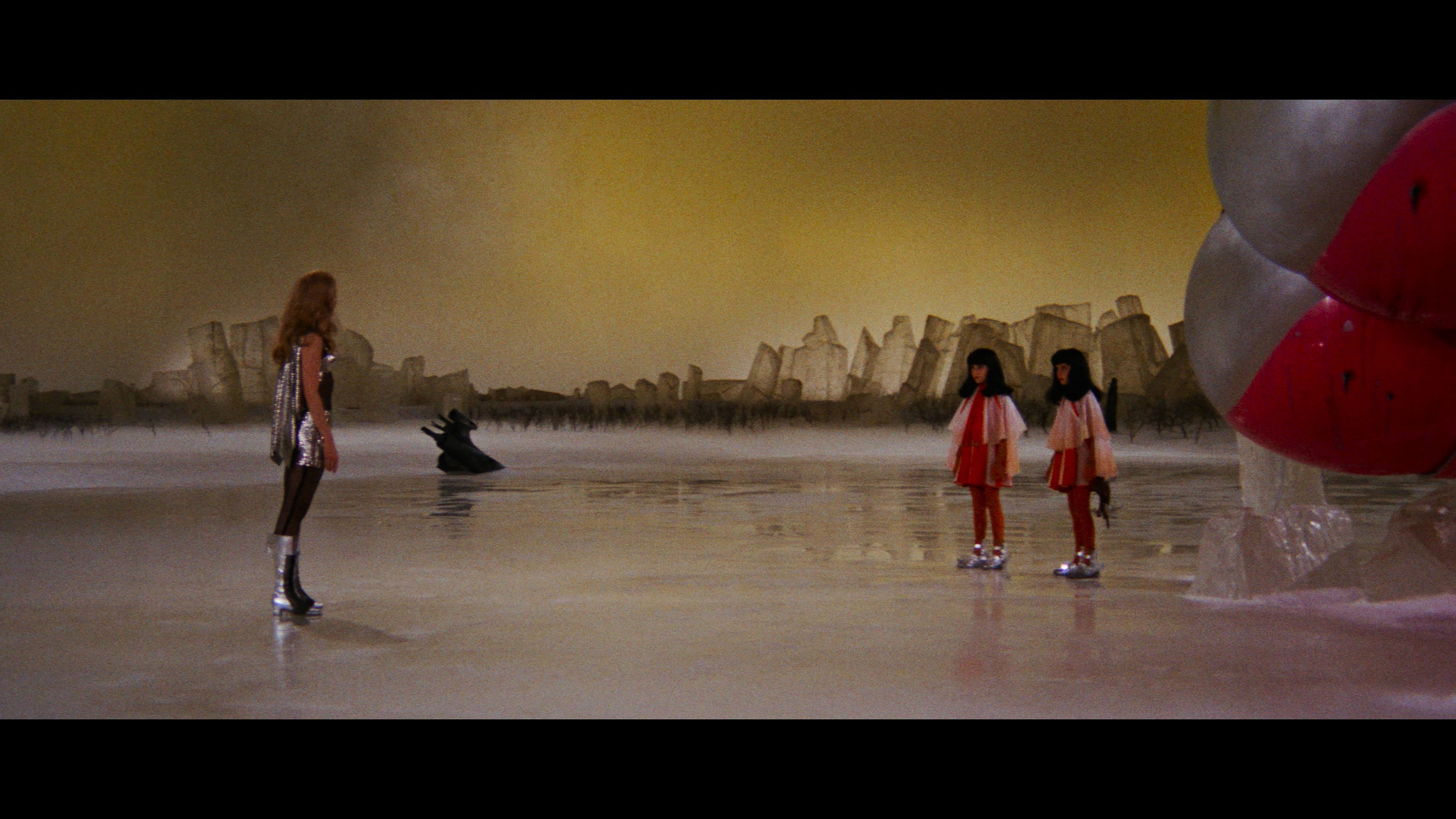 second Blu-ray of supplemental features. The UHD (in Dolby Vision, HDR10 compatible) is definitely the way to go if you're capable, featuring a new restoration of the film from the original negative improving on the already excellent prior Blu-ray with richer color and finer detail. You also get DTS-HD MA English 2.0 and French 2.0 mono tracks with optional English subtitles, plus a new Dolby Atmos mix (as opposed to a Mathmos mix. The iconic soundtrack (scored by the great Charles Fox with songs by Bob Crewe and The Glitterhouse) still sounds punchiest in its mono mix, but the Atmos option is an entertaining variant if you want to hear it spread all over the room. It's worth noting that this track is devoted only to the music score in its original mono film mix (including many extended bits that weren't on the extensive soundtrack LP release) and remains silent during the songs. Tim Lucas provides an extensively researched and informative audio commentary covering the film's comic strip origins, Dino's process of mounting the film including other casting options (and its connections to Danger: Diabolik), the film's place in Euro cinematic science fiction, the execution of the amusing in-camera visual effects, and ties to other late '60s titles. Also included on the first disc are alternate opening and closing credits, the former notable for the alternate placement of David Hemmings' credit and the latter for crediting the score to composer Michel Magne before his work was rejected. (The rejected score was later issued on CD as part of a Vadim collection, though it's pricey now.)