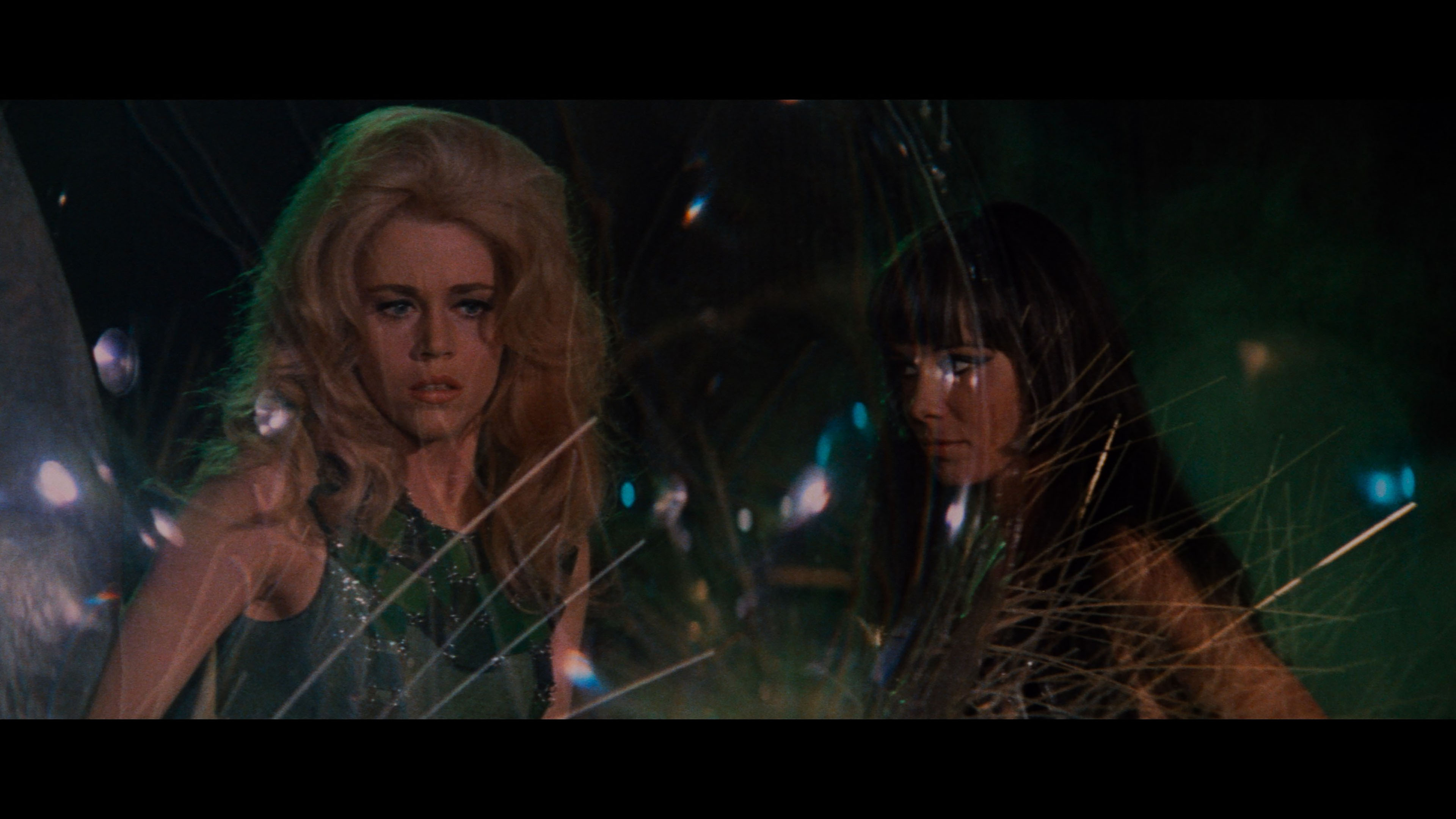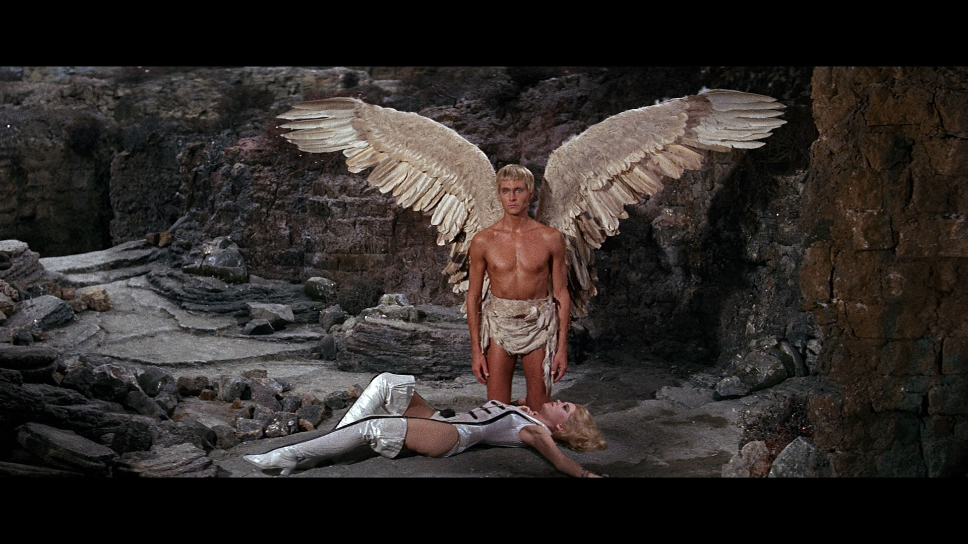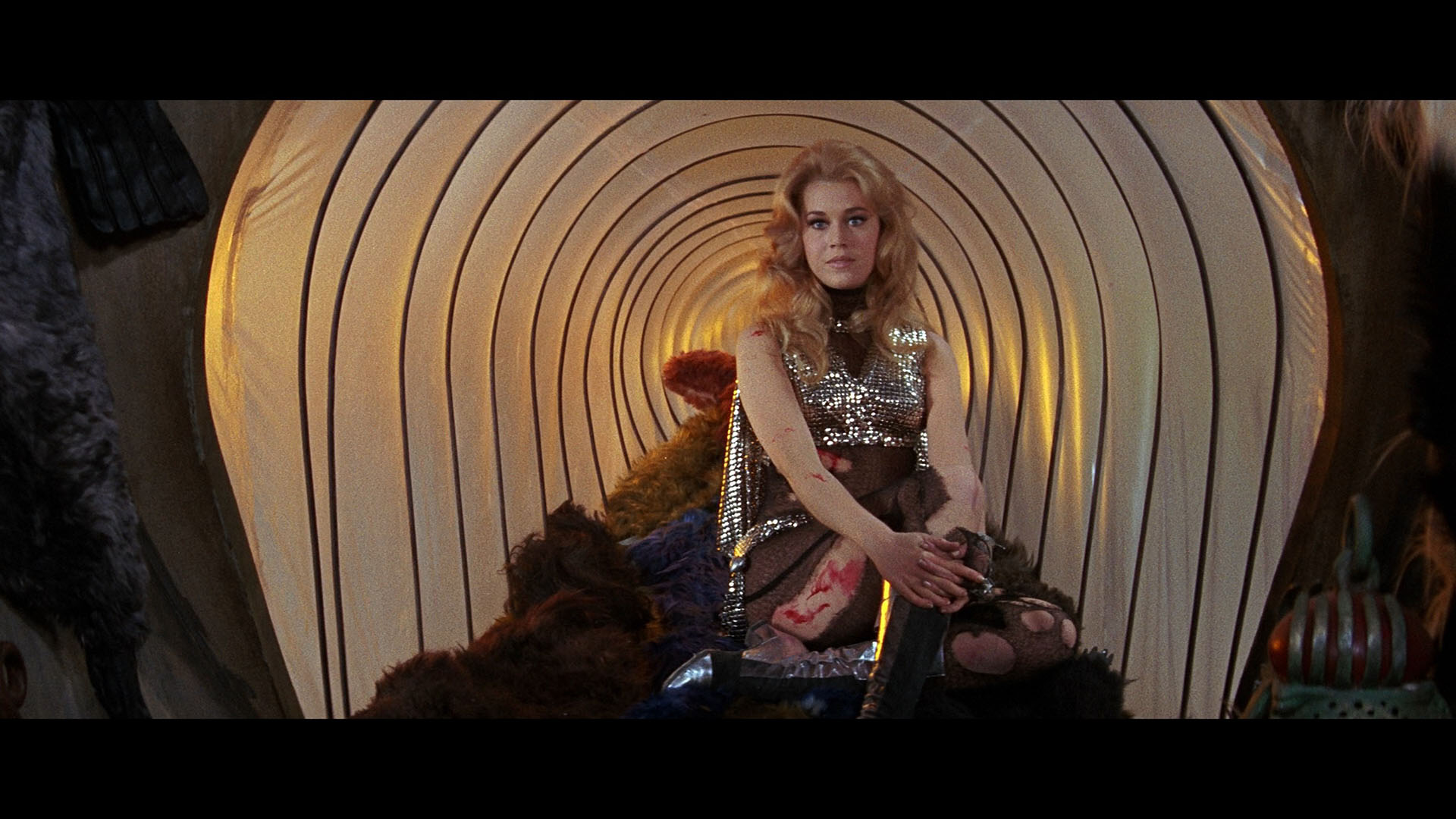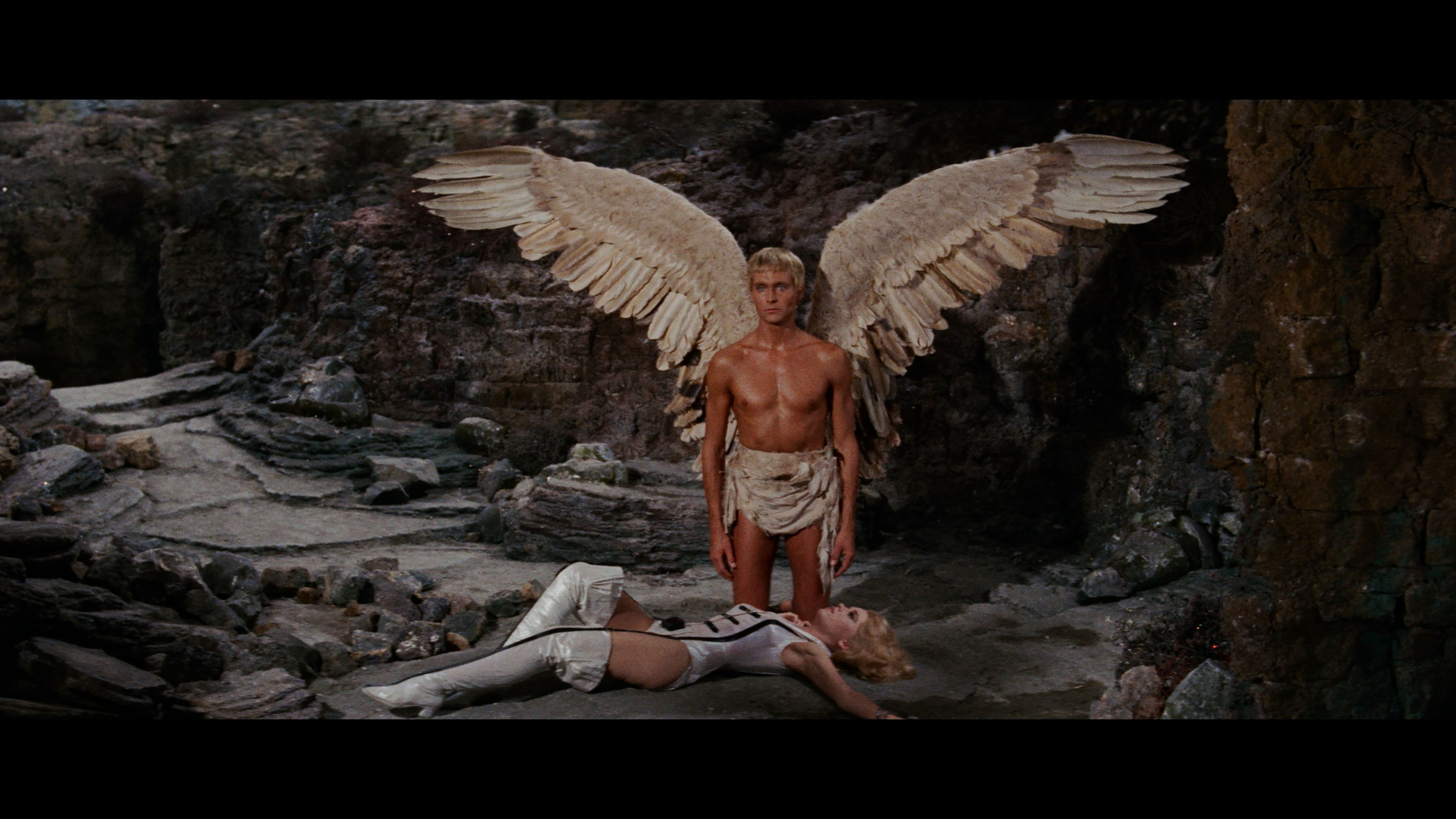 second Blu-ray of supplemental features. The UHD (in Dolby Vision, HDR10 compatible) is definitely the way to go if you're capable, featuring a new restoration of the film from the original negative improving on the already excellent prior Blu-ray with richer color and finer detail. You also get DTS-HD MA English 2.0 and French 2.0 mono tracks with optional English subtitles, plus a new Dolby Atmos mix (as opposed to a Mathmos mix. The iconic soundtrack (scored by the great Charles Fox with songs by Bob Crewe and The Glitterhouse) still sounds punchiest in its mono mix, but the Atmos option is an entertaining variant if you want to hear it spread all over the room. It's worth noting that this track is devoted only to the music score in its original mono film mix (including many extended bits that weren't on the extensive soundtrack LP release) and remains silent during the songs. Tim Lucas provides an extensively researched and informative audio commentary covering the film's comic strip origins, Dino's process of mounting the film including other casting options (and its connections to Danger: Diabolik), the film's place in Euro cinematic science fiction, the execution of the amusing in-camera visual effects, and ties to other late '60s titles. Also included on the first disc are alternate opening and closing credits, the former notable for the alternate placement of David Hemmings' credit and the latter for crediting the score to composer Michel Magne before his work was rejected. (The rejected score was later issued on CD as part of a Vadim collection, though it's pricey now.)