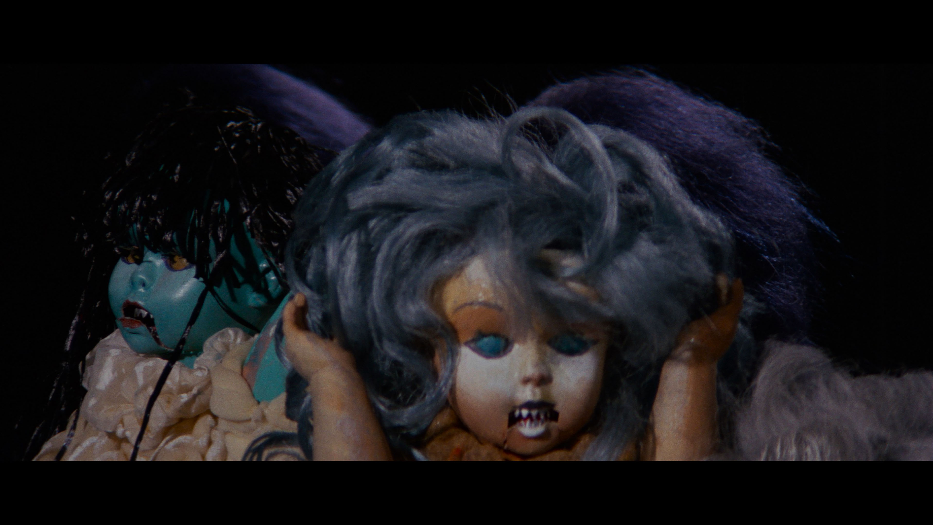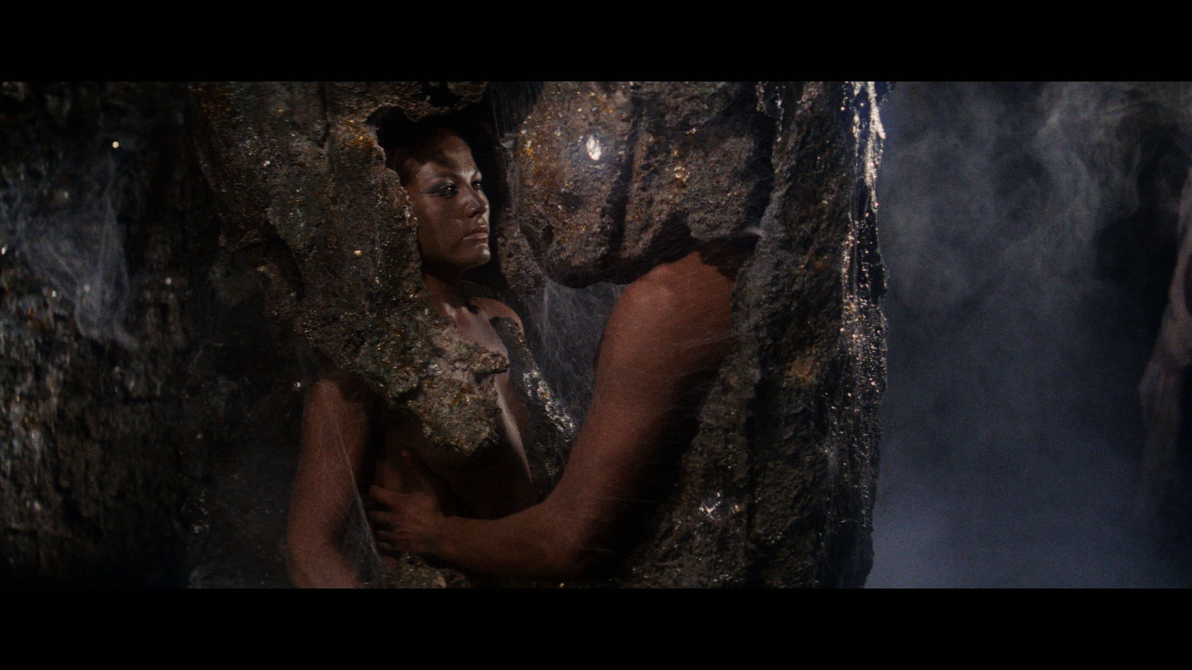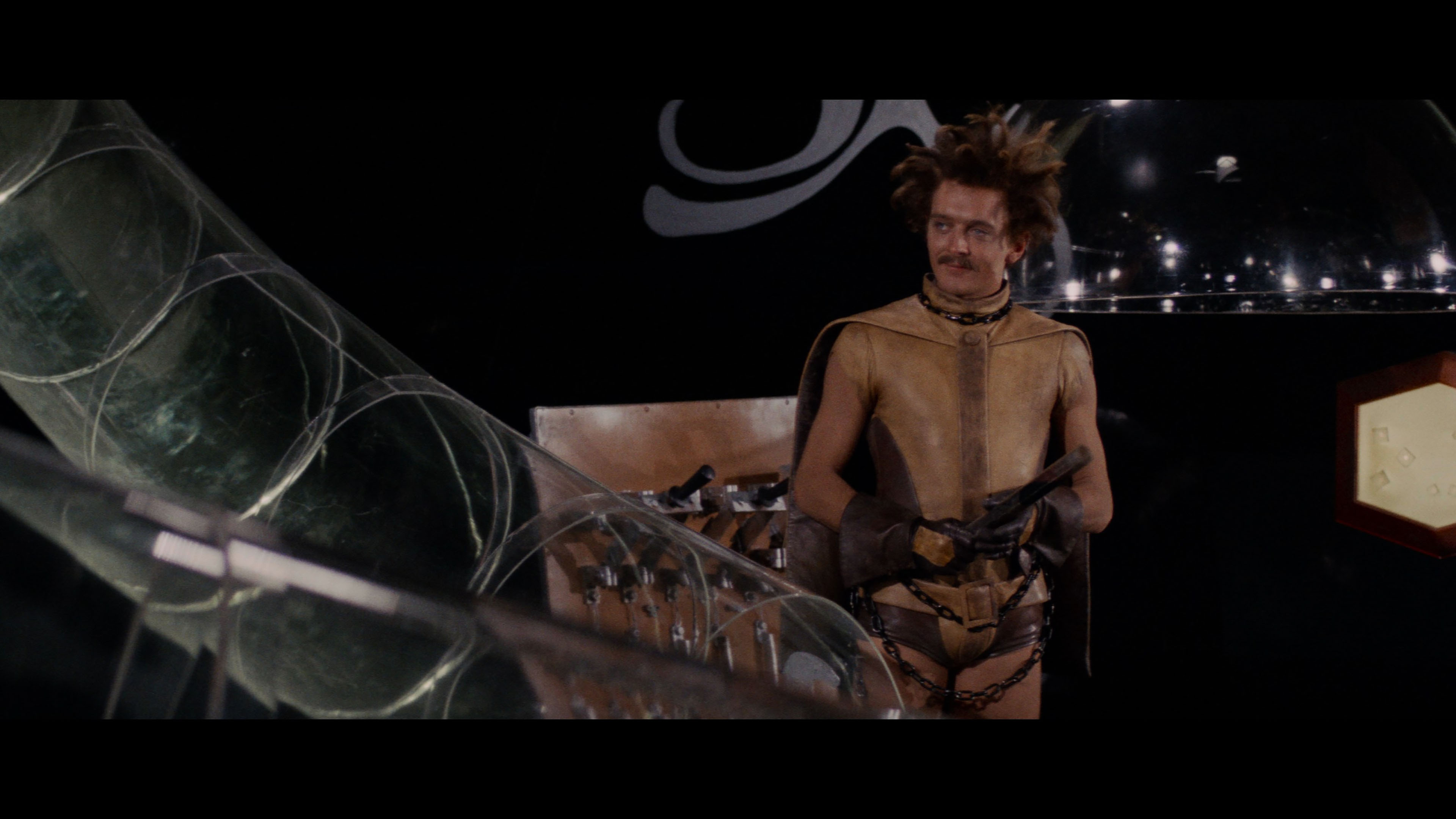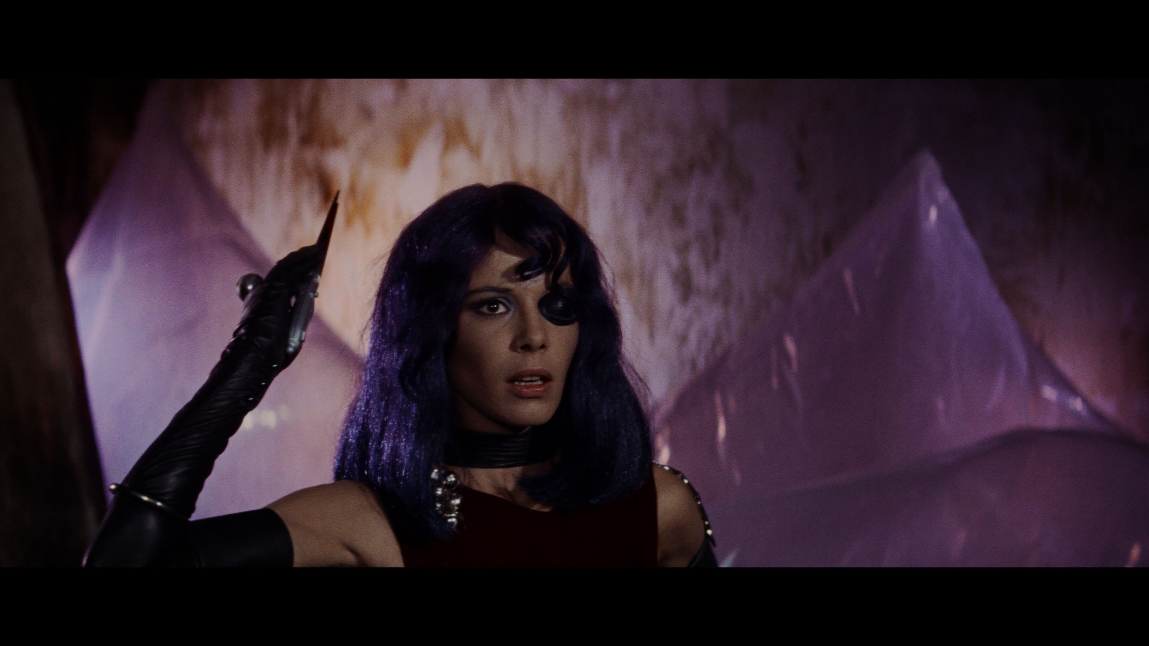 second Blu-ray of supplemental features. The UHD (in Dolby Vision, HDR10 compatible) is definitely the way to go if you're capable, featuring a new restoration of the film from the original negative improving on the already excellent prior Blu-ray with richer color and finer detail. You also get DTS-HD MA English 2.0 and French 2.0 mono tracks with optional English subtitles, plus a new Dolby Atmos mix (as opposed to a Mathmos mix. The iconic soundtrack (scored by the great Charles Fox with songs by Bob Crewe and The Glitterhouse) still sounds punchiest in its mono mix, but the Atmos option is an entertaining variant if you want to hear it spread all over the room. It's worth noting that this track is devoted only to the music score in its original mono film mix (including many extended bits that weren't on the extensive soundtrack LP release) and remains silent during the songs. Tim Lucas provides an extensively researched and informative audio commentary covering the film's comic strip origins, Dino's process of mounting the film including other casting options (and its connections to Danger: Diabolik), the film's place in Euro cinematic science fiction, the execution of the amusing in-camera visual effects, and ties to other late '60s titles. Also included on the first disc are alternate opening and closing credits, the former notable for the alternate placement of David Hemmings' credit and the latter for crediting the score to composer Michel Magne before his work was rejected. (The rejected score was later issued on CD as part of a Vadim collection, though it's pricey now.)