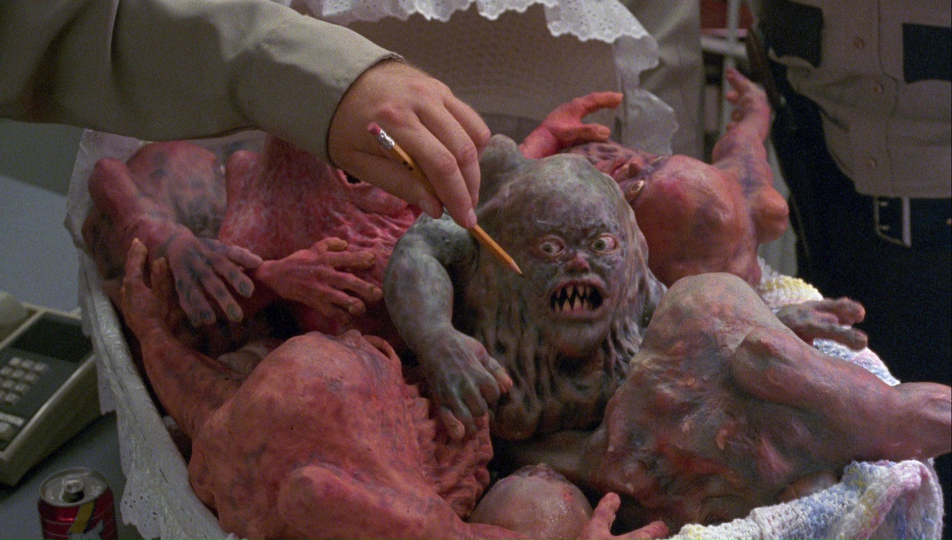 The transition from darkly humorous gritty gore to daffy monster comedy finally reached its climax with the Georgia-shot Basket Case 3, which was shot back to back with the already outrageous Basket Case 2 in the early '90s. Following a quick reprise of the chaotic final minutes from Basket Case 2 (which won't be described here for those who haven't seen the film), we pick up a few months later with Duane (Van Hentenryck) held in a straitjacket under observation in the house of Granny Ruth (Ross), who's busy with her freakish tenants helping out Belial's pregnant girlfriend. Meanwhile Belial, still traumatized from recent events, isn't talking (psychically, that is) to Duane but has to come out of his shell in time to become a new dad.