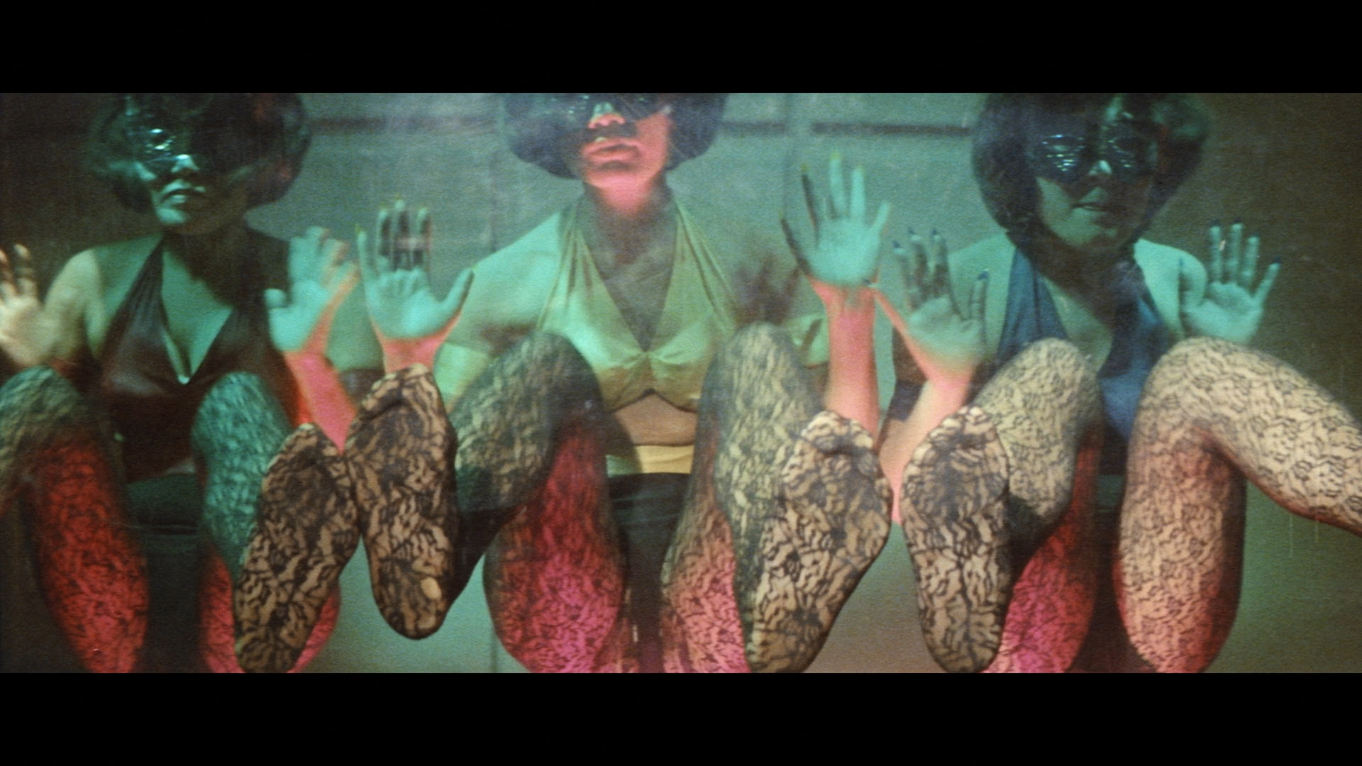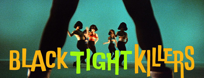and stylized, Black Tight Killers offers an equally dazzling display of pop art compositions, groovy music, and outrageous plot twists, all performed in tongue-in-cheek style by an enthusiastic cast. The title pretty much sets the mood, not to mention opening credits featuring a line of gyrating femmes in skin-tight outfits go-go-ing their hearts out on day-glo sets out of a '50s MGM musical.
