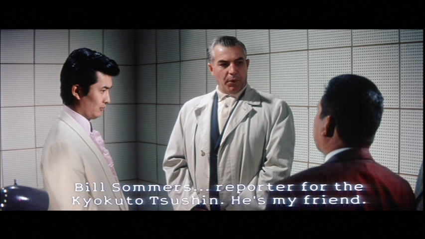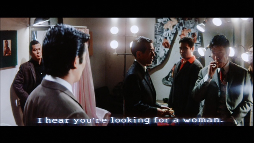 Though not one of the better known Japanese spy films, Black Tight Killers has held up well over the years and looked fine back in 2000 in its DVD debut from a print acquired by the American Cinematheque. The punchy colors and scope framing were fine, but the only subtitled print in existence meant the subs are burned-in with touch-and-go results including numerous typos. The disc (packaged with extensive liner notes by Chris D. from the Cinematheque at the time) also includes a 20m58s interview with director Yasuharu Hasebe in a video store, with an American providing translated voiceover for his comments about cinematic influences,