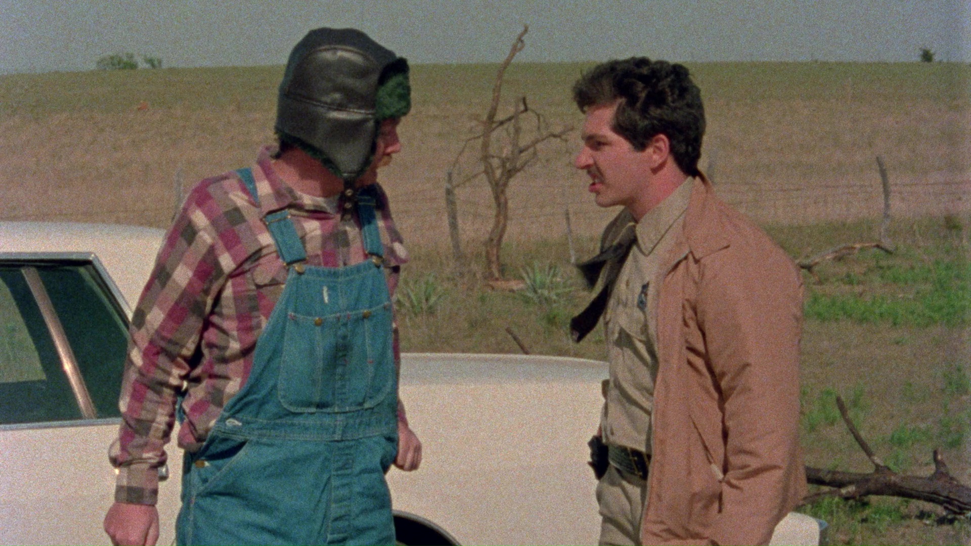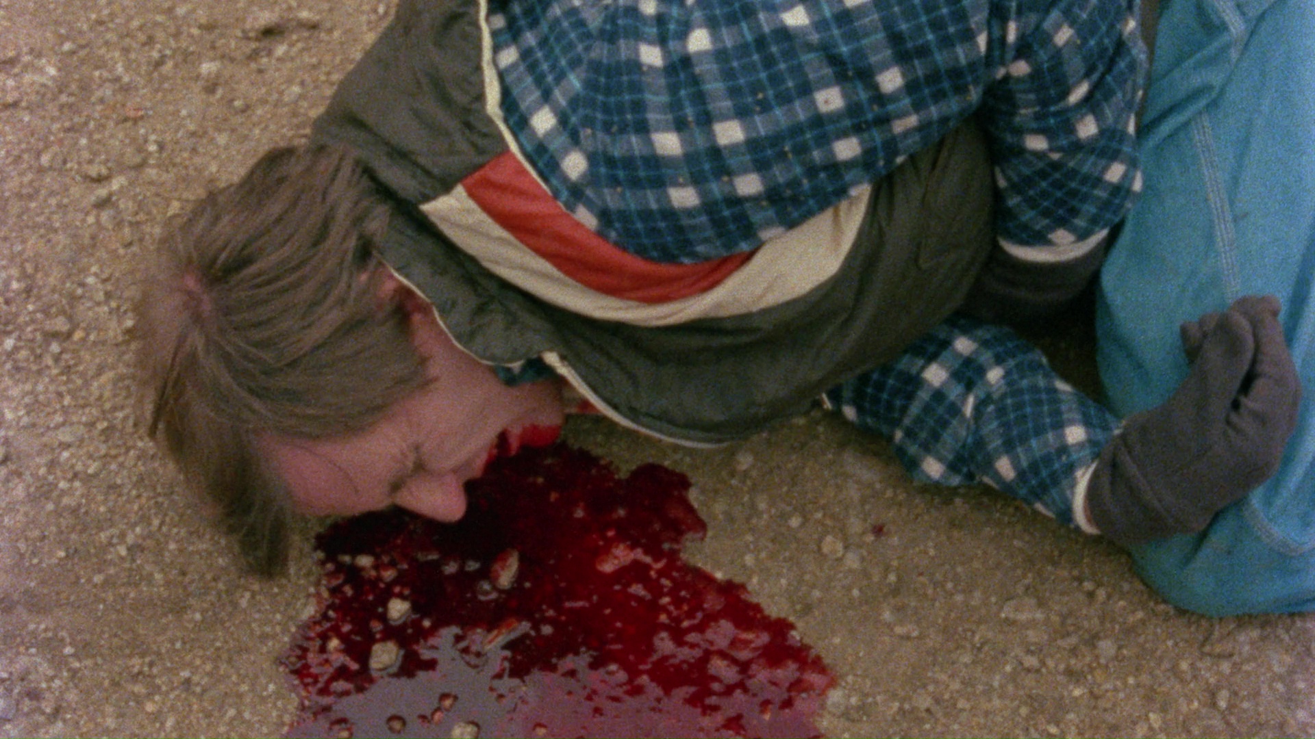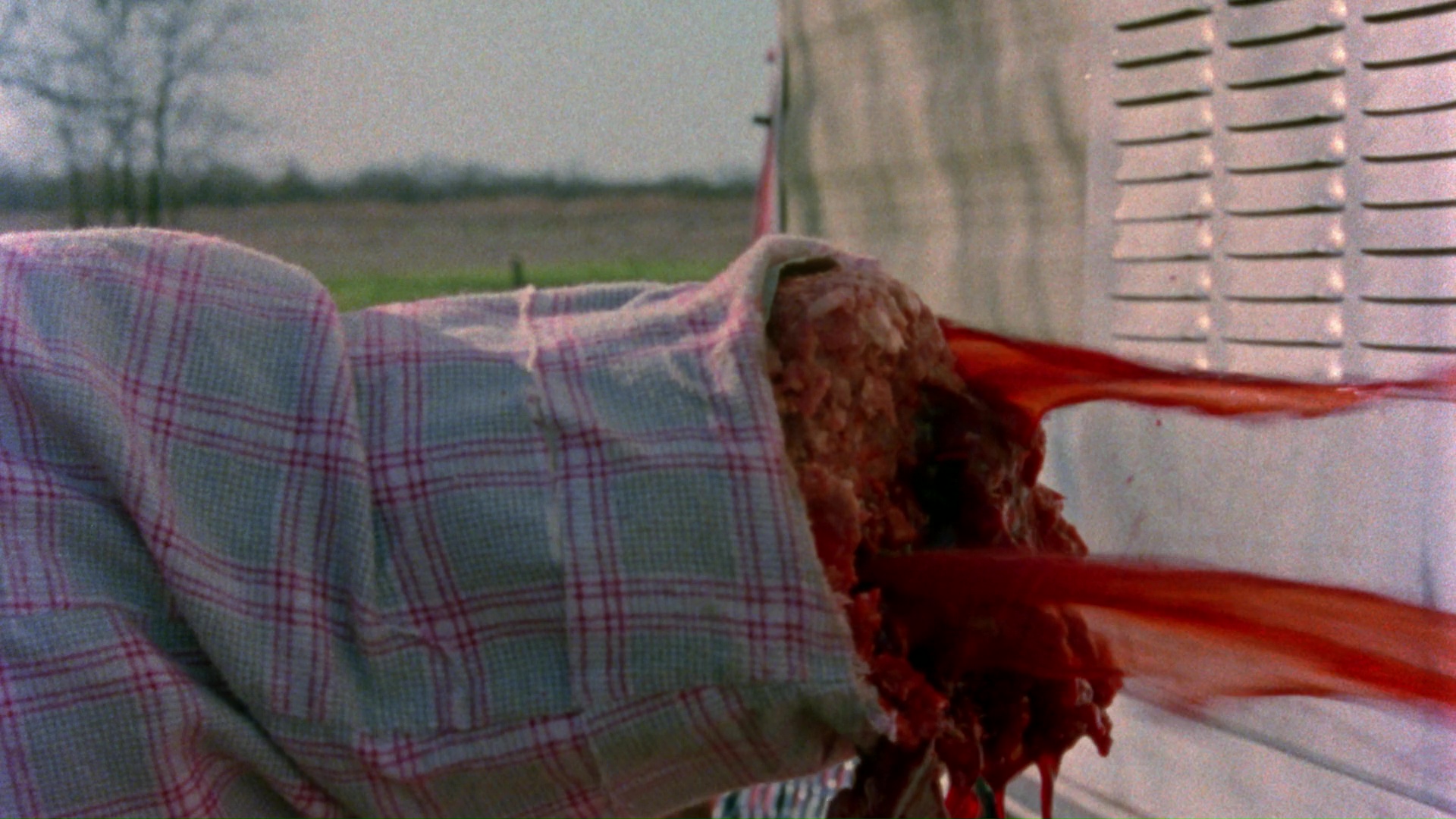 On the extras side, the Vinegar Syndrome starts over from scratch with Coburn and company returning for a whole new slate. An audio commentary with Coburn, Meyers, and cinematographer Chad D. Smith is amusing and full of anecdotes ("Is this a farm documentary?"), though there's a lot of echo and background noise that makes it inadvisable to try out with headphones. "34 Years Later" (51m45s) essentially updates the older featurette with Coburn charting his course from amateur short films to this homegrown production; he's also joined by other vets including Meyers, Smith, make-up artist Tim McDowell, sound man Michael Haines, and actors-Dan Gallion (the blood-barfing farmer), Kris Nicolau, and Dennis Letts, among others. In "Back To Bloodsucker Town" (15m51s), Smith kicks off a look at the Enloe, Texas locations then and now with some of the other interview participants chiming in about finding the various streets and storefronts. This piece also has some really odd, extreme motion blurring at times, so don't worry, it's not your player's fault. The goofy "Bloody Arm Rip 101" (4m44s) featuring the makers of Atom the Amazing Zombie Killer is a very cheerful, silly guide to replicating the arm chop using Black Cherry Kool-Aid and corn syrup, complete with a splattery ending. Finally you get a hefty gallery of production photos (10m22s).