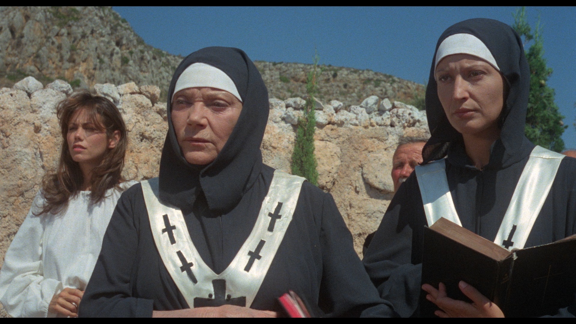 After a young woman is prepared for an apparent nocturnal sacrifice and sent floating into an ancient watery cave, our story proper involves newlyweds Sherry (Weller) and shirt-allergic Neil (Kove) Blood Tidearriving at an island village whose mayor (Ferrer) seems to have something to hide. They're in search of his sister, Madeline (Shelton, pre-Body Double Blood Tidebut post-Dangerous Cargo despite her "introducing" credit here), and end up crossing paths with a treasure hunter, Frye (Jones), and his girlfriend, Barbara (Cornell), who seem to have awakened an ancient evil on the premises. Also on hand is a mysterious order of nuns (led by Lila Kedrova, who was probably on set for two days max), who know more than a bit about the dark rituals behind the monstrous secret lurking nearby.