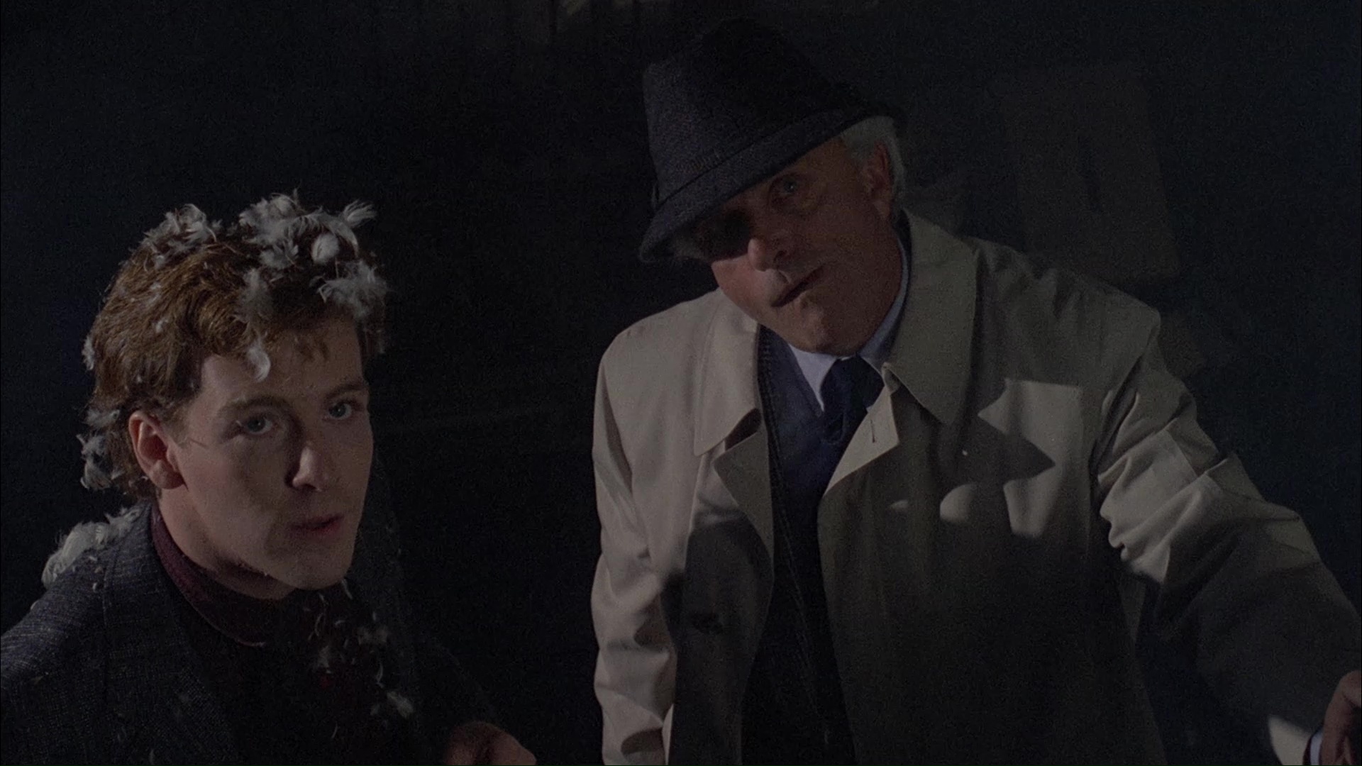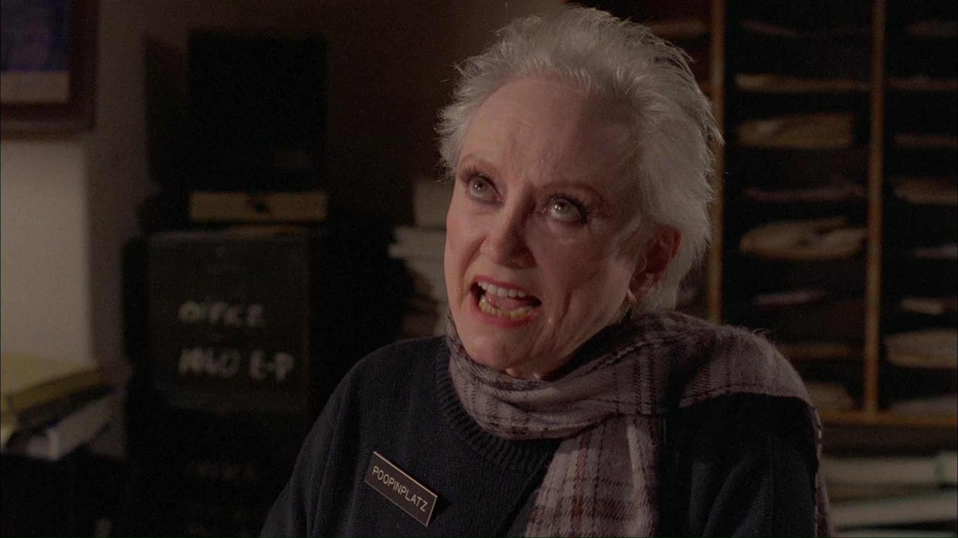 Trenchcoat-wearing police detective Jersey Callum (TV vet Nelson) and his sidekick, Gordon (Eustermann), decide to poke around the house of psychic Alley Oates (Rose) to apparently annoy her into helping them out with a case involving three dead kids preserved down at the local morgue. Alley's more than a little reluctant to get back in the business of solving child murders, but she reluctantly agrees and accompanies them to tangle with the powers that be at the mortuary, namely coroner Shepard (Three's Company's Fell, wearing a big fake mustache) and secretary Miss Poopenplatz (Diller), not to