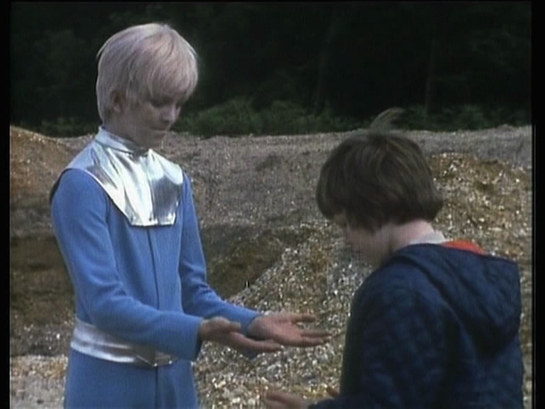 The main storyline here is essentially a variation on the formula later perfected in E.T. with a couple of young siblings, Dan (The Tomorrow People's Garlick) and Helen (Happy-Go-Lucky's Le Touzel), spying an object from space landing nearby while watching the stars. They decide to go hunting for the mystery asteroid and instead find a crashed ship with some highly unusual alien inhabitants. Among them is a platinum-blond boy (Mayes) whose chirpy backwards language inspires them to name him "Peep-peep." Far more menacing is another visitor the children refer to as "the Thin Space Man" (Lifeforce's Woodnutt), an ominous foe who puts the pint-sized heroes in grave danger when they manage to decipher the evil hold he has over their interstellar friend.