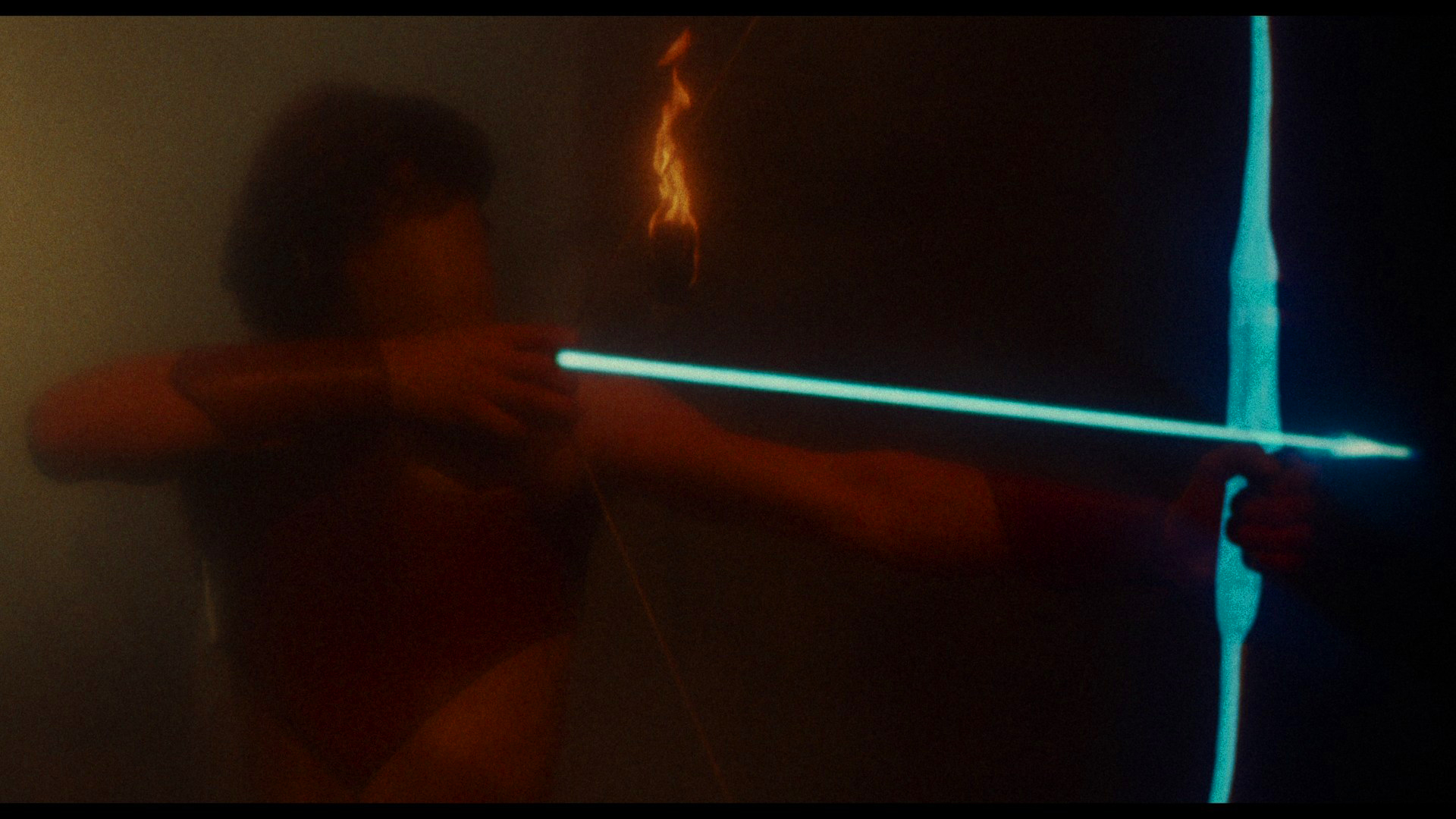 When he sets out on his own after reaching adulthood, Ilias (The New York Ripper's Occhipinti), armed with a magic bow that fires glowing arrows, appears as a faceless threatening vision to the evil, tyrannical, and always topless Ocron (2020 Texas Gladiators' Siani), the gold-masked leader of a group of marauding monsters. Ilias teams up on his vision quest with Mace (Mexican drive-in star Rivero), a master swordsman. Various captures, rescues, and creature encounters ensue as the two men journey together and separately with an increasingly desperate Ocron making a supernatural pact in a bid to stop them for good.