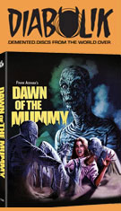 Laser Paradise issued the first DVD of Dawn of the Mummy after years of unavailability, and it was a slight improvement over the unwatchably murky Thorn/EMI VHS. Of course, this film always had the appearance of being projected on a strip of dirty burlap and suffers from pale, lifeless colors and shadows. The Anchor Bay disc in the U.K. from 2003 (the country's first uncut home video release) was a noticeable step up though still limited by the mediocre nature of the original source material; the film's cinematography during the night scenes and crypt explorations is quite shoddy and features muddy lighting. Daylight scenes are crisp and colorful, however. The 5.1 remix is obviously fake and processed but fun, delivering outrageously amplified sound