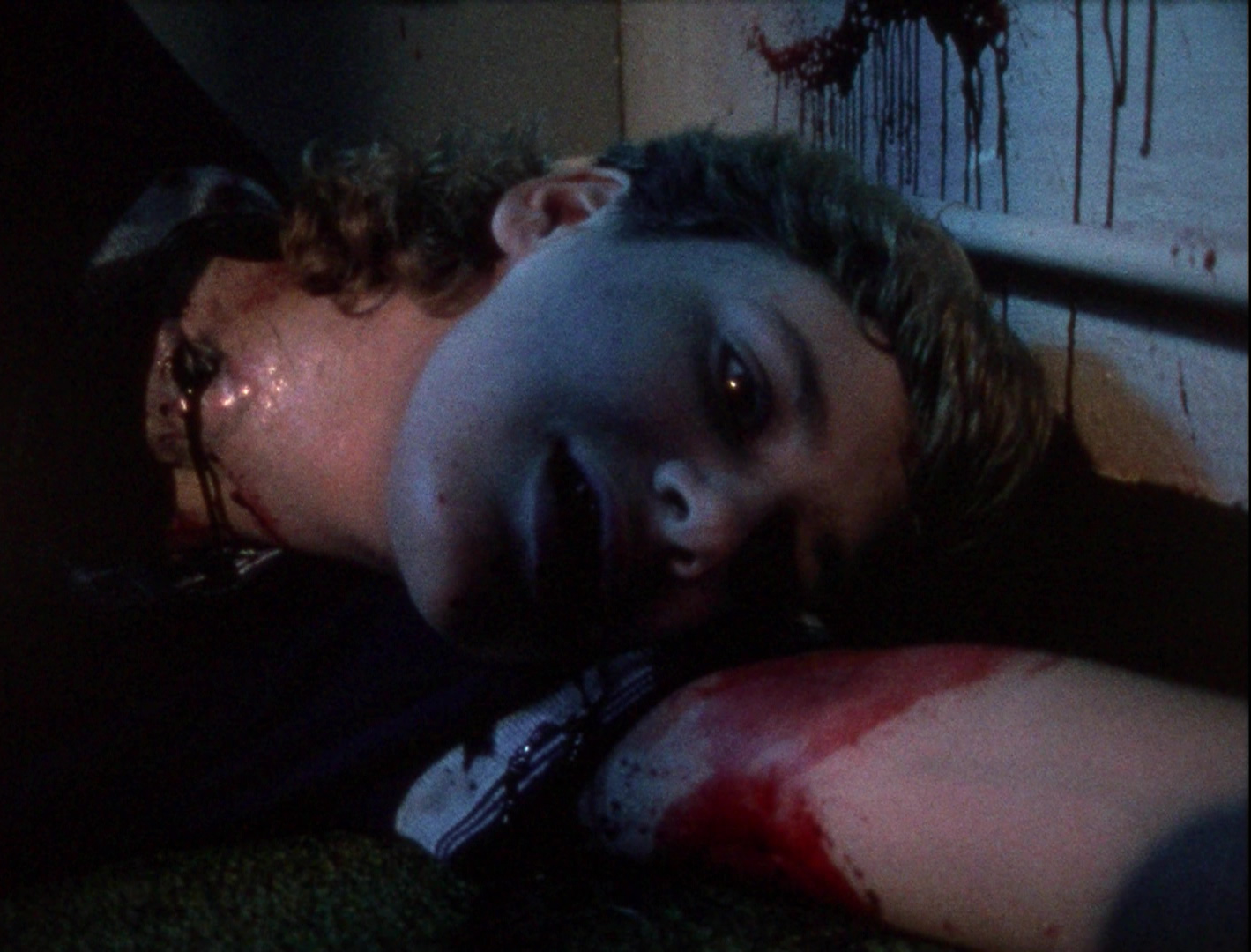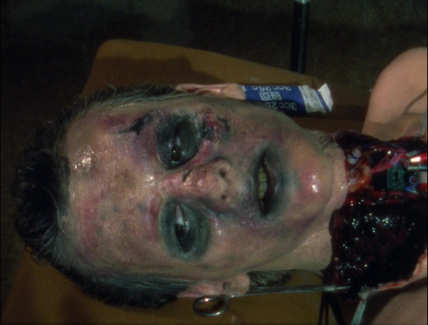 As anyone who viewed the original VHS of The Dead Next Door noticed immediately, the film was shot on film but clearly edited on video with low-grade credits easily marking it as a straight-to-video project of the time. (The opening title card is a particularly obvious offender.) Since no edited version existed on film, the original unprocessed footage had to be exhumed for its DVD premiere in 2005 from Anchor Bay, complete with new credits generated for the opening and closing titles as well as location identifiers. The running time also changed from 82 minutes to 78 due to these changes, so nothing really substantial was altered apart from an aesthetic update. The film elements were still visibly damaged throughout, but at least the DVD marked a big step up in terms of visual quality. Some of the original film elements were lost somewhere along the line, so some shots (mostly cutaways to people running or reacting) had to be sourced from the VHS master, graded as well as possible to match the new transfer. That release includes a 5.1 remix, a 2.0 stereo option, and a lively audio commentary (with Bookwalter, actor Michael Todd, and cinematographer Michael Tolochko),
