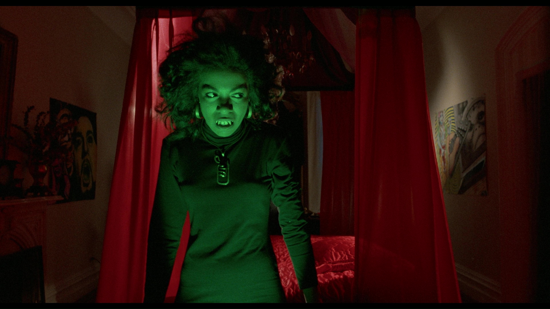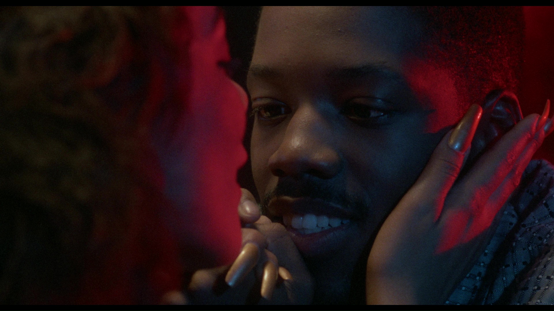 particularly striking limited slipcover edition directly from the label. The new 2K-scanned transfer from the original camera negative is a much, much easier on the eyes than past releases, finally snapping all those vibrant reds and blues into perfect clarity and doing a much better job of handling the darker, smokier scenes where you can now tell exactly what's going on. Likewise the DTS-HD MA 2.0 English audio sounds punchier than the DVD, and optional English SDH subtitles are included. The film can also be played with a career-spanning phone discussion between James Bond III and Vinegar Syndrome's Joe Rubin, covering everything from his early calling to take up acting through some of his significant roles and his segue into directing with this film, which sprang out of a connection to Go Tell It on the Mountain and involved a deep dive into researching horror and exploitation films. (He most definitely watched Videodrome.) He chats for the entire length of the film, and be sure to stick around till the end where he explains what he's been doing and why he turned down other film offers after this was released. Billed as a "candid conversation," "Ernest & Lloyd" (20m18s), which was recorded for one of the DVD reissues, is an amusing chat between Ernest Dickerson and Lloyd Kaufman about the process of bringing this film to Troma, the financial arrangement that got this film off the ground, and Dickerson's love of the horror genre that led him to do this right after Do the Right Thing. Another SD carryover is a brief appraisal from Michael Gingold (2m8s), who puts it in context as a pioneering title after a long lull since the likes of Blacula. He points out something really fun about the climactic monster, too. A gallery of promotional clippings and articles about the film (1m) is also included along with the theatrical trailer.