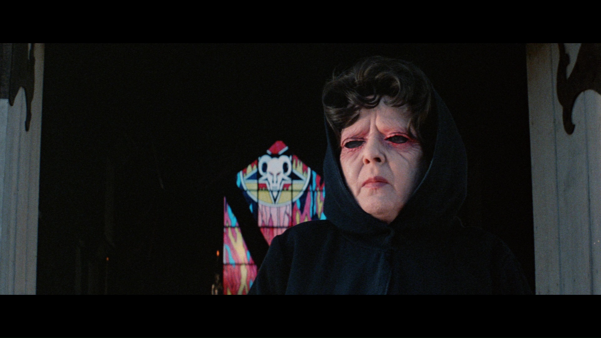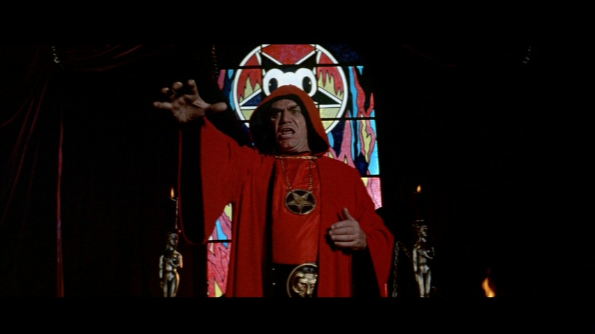 Dark Sky's 2006 anamorphic upgrade restores the entire 2.35:1 framing and looks more vivid, thanks to being sourced from a more recent hi-def transfer. Color and detail level look improved throughout, though some of the artistic choices get pretty odd with more clarity; for example, Lupino's backseat car attack on Prather would have been quite frightening except that it takes place in broad daylight, where every flaw in her make-up stands out like a sore thumb. The extras are easily worth the spin as well, kicking off with Robert Fuest's lively commentary track. He discusses most of his career from his early production design days through his most famous titles, discussing the actors along the way and even debunking Cinefantastique's claim that he suffered a breakdown after shooting this film. Also included is the unforgettable theatrical trailer (much better than that VCI one) that includes some great '70s paintings, three radio spots, and a brief (34-second) B&W newsreel clip of LaVey in action.