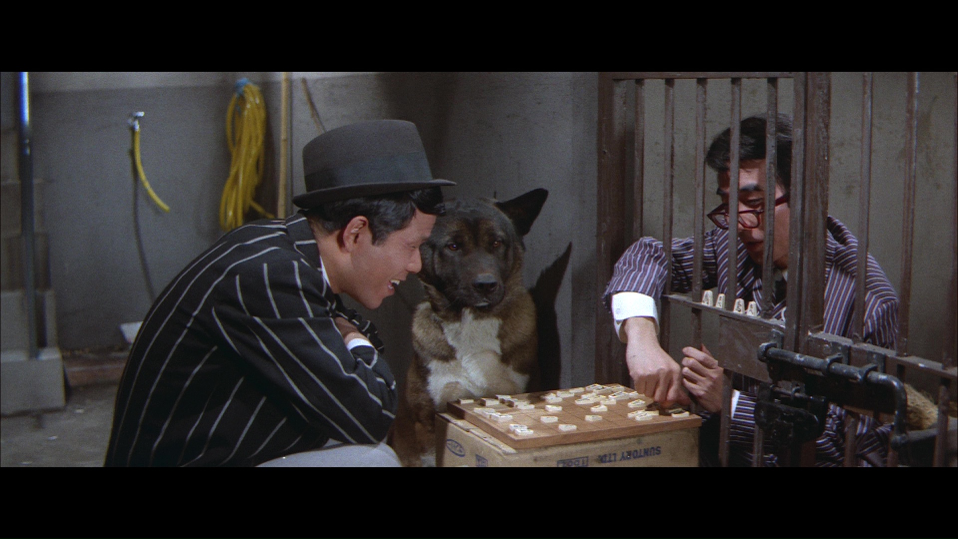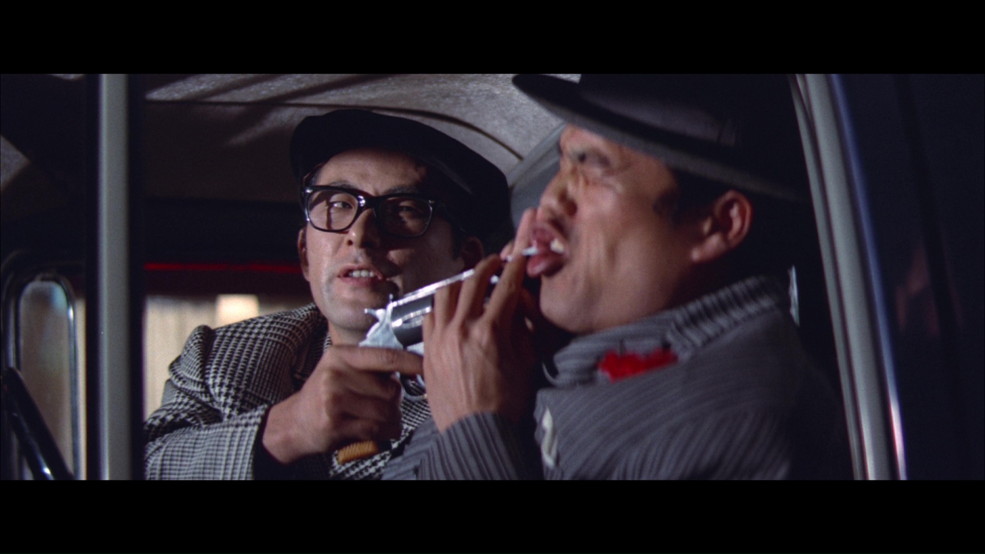 Of course we have to get puffy-cheeked Jô Shishido in here somewhere, and he actually pops up in both of the next features. Danger Pays revolves around the calamity when a huge stash of watermarked money-printing paper gets swiped , enough to generate two billion yen in counterfeit cash. Joe the Ace (Shishido) is the lighthearted, ostensible leader of some low-rent guys, and he comes up with a plan to hook up with a famous counterfeiter. However, everything goes awry in a random string of events that leads to false identities and trips to a nightclub called Club Acapulco where scantily clad girls do splits on a glass floor over the criminals. There's a lot more slapstick here; for example, one character named Glass-Hearted Joe throws a screeching fit when he hears metal or glass being scraped, Joe gets to zip around in a little red mini car, senior citizens cry and freak out, and so on. On the other hand you get some great '60s jazz, colorful fashions and hairdos, and a sweet female badass (Asaoka) who beats up a few of the male cast members.