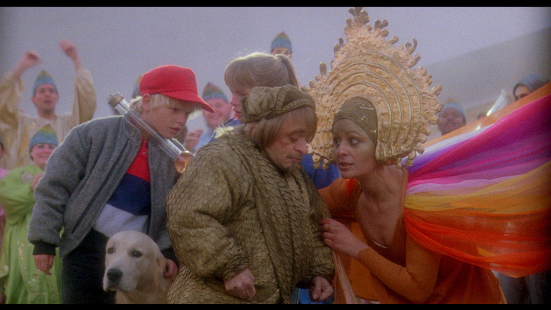 Then we jump ahead to "Tales for All #5" and the one that really rivals The Peanut Butter Solution as the weirdest film in the series: The Great Land of Small, which was picked up for U.S. distribution theatrically and on VHS by New World Pictures (with a budget tape reissue from Starmaker found briefly at fine drugstores everywhere). This one was shot with the actors speaking English but was also prepared in a French Canadian version (as C'est pas parce qu'on est petit qu'on peut pas être grand!, or Just Because We're Small Doesn't Mean We Can't Be Big!), with its songs performed in both languages. Incredibly, this was directed by major Czech filmmaker Vojtěch Jasný (The Cassandra Cat), who was also one of the writers of Peanut Butter. The story revolves around two children, Jenny (Elkin) and David (Blouin), who keep crossing paths with the diminutive, magical Fritz (Michael J. Anderson, later famous for his backward-talking turn in Twin Peaks). Hailing from a magical realm called the Great Land of Small, Fritz has powers reliant on magical gold dust that's been stolen by an unscrupulous hunter, Flannigan (Roberts). Along with the hulking Mimmick (Tremblay), Fritz and the kids journey via boat to the Great Land of Small where they encounter a whimsical population of acrobatic performers (played by an early incarnation of Cirque du Soleil) as well as a King and Queen (Anderson and Desmarais, who also plays the children's circus performer mom) who placate the populace with a levitating monster called Slimo.