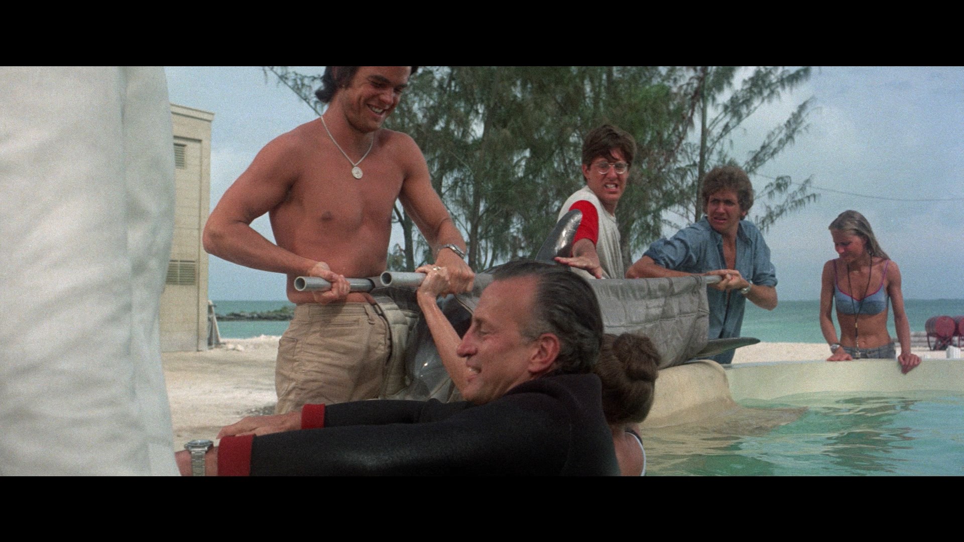 while mostly offering a general overview of how to approach the film, the significance of a few scenes to the overall agenda of the film, Nichols' attitude to the film during and after its creation, and the intricacies of the sound design. The three archival interviews are ported over here (separated again as with the DVD), but some new interviews are added as well. In "Days of My Life" (43m46s), actor Jon Korkes provides an extremely thorough account of the film's production including his memories of Nichols starting with Catch-22, the loose casting process for this film, the arduous production process starting in Miami and then focusing mainly in the Bahamas, and the eventful and sometimes friction-filled interactions during the shoot, which at least allowed them to have first-run movie nights together. Apparently Nichols' legendary improv skills came in pretty handy, too. Then in "Moon Over the Bahamas" (39m24s), second assistant director and longtime Nichols collaborator Michael Haley gives a very colorful account of his earlier days learning the trade on adult films and The Honeymoon Killers through his first acting experience opposite Sophia Loren and his many Nichols projects starting with this film all the way through Charlie Wilson's War. Also included are the theatrical trailer (in its original form and a Trailers from Hell version presented by Larry Karaszewski), a very lackluster TV spot, 86s of radio spots, and a 66-image gallery of stills and promotional material. The 3,000-unit limited edition comes with a 36-page booklet featuring a perceptive new essay by Neil Sinyard ("Another World") about the film's place in Nichols' work, extracts from interviews with Nichols and Levine over the years, an archival Los Angeles Times with interview with Van Devere, samples from the dolphin conversations in the source novel, and three sample critical reactions from the initial release.