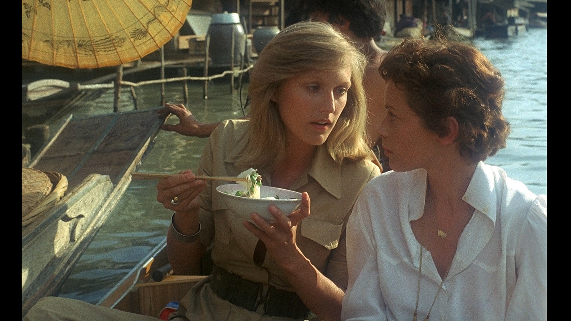 covers his own career starting in commercials and moving to vast success with this film and its successors. In “Filming Emmanuelle” (16m19s), Fraisse recalls his own experience as a cinematographer and camera operator, working to support newcomer Richard Suzuki as director of photography, the major shifts in industry practices since then especially since the advent of the Steadicam, and enjoying shooting in Thailand for the first time. In “Fabric & Fantasy: Costume As Character Development” (14m6s), fashion and costume historian Elissa Rose explores the use of color and style changing between the films as well as perceptive observations about the influence of Hollywood Pre-Code films and the myriad cultures at play in the stories charting the character’s sexual progression. In “The Channel” (14m9s), actress Liane Curtis discusses the work of her mother, dubbing artist Paulette Rubinstein (who graced many Japanese, Italian, and French productions), whose career spanned from Broadway to film work to voicing characters like this who changed the world. Oh, and Liane’s dad was Jack Curtis, the man who brought you The Flesh Eaters. Also included on the first Blu-ray is a press interview with Rollet-Andriane (2m6s) on the set of The Sand Pebbles, while a second Blu-ray features an additional