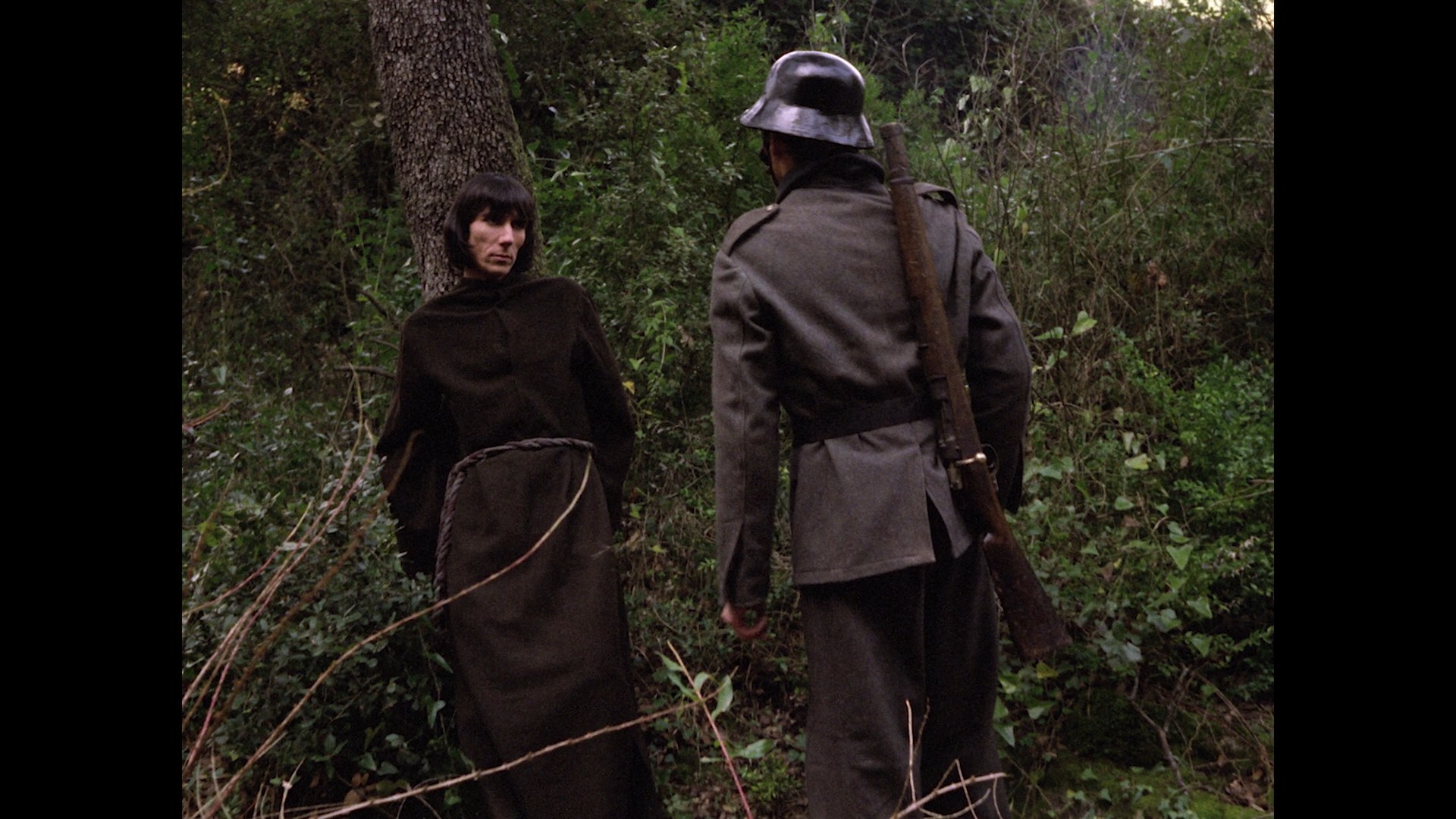 From there we go to a fascinating riff on Teorema with Dimorfo, directed by and starring the enigmatic Rodjara who apparently went on to work in TV animation. During World War II, a Jewish hermit in monk garb, Salomon (played by our filmmaker), ends up in the crosshairs of Nazi soldiers after he helps a naked, dying man in the woods. He ends up finding refuge at a farmhouse where he ignites sexually voracious behavior in the residents including married couple Aleja (Fontsa), who's heavily closeted and miserable, and frustrated Ana (Valer), as well as the elderly Rebeca (Caracuel), a suspiciously masculine old grandmother type who shaves. An obviously personal and peculiar passion project, this one also uses a library music soundtrack (in this case Stelvio Cipriani's The Killer Is On the Phone!)