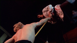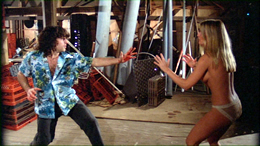 However, Santiago and writer Metcalfe also teamed up seven years later for a virtual remake of this film, except with a shapely blonde martial arts master starring instead. Firecracker (also known as Naked Fist) stars another sitcom actress, Co-Ed Fever's Jillian Kesner (the late Mrs. Gary Graver!), as Susanne Carter, a martial arts expert in the Philippines looking for her vanished sister only to tangle with the criminal underworld, who... well, sound familiar? One new wrinkle this time is introduced right in the opening scene as we witness a covert den where martial artists are pitted against each other to the death, with American badass Chuck Donnor (Malibu Express' Darby Hinton) dispatching his opponent with a spear to the chest in midair. Of course, it's only a matter of time before Susanne and Chuck get nasty in the sack (a kinky scene in which they slice each others' clothes off with a knife and straight razor), but that's nothing compared to this film's amped-up reprise of TNT Jackson's topless fight scene with Kesner losing her bra to a scythe and continuing to take on a horde of baddies. This one also outdoes the prior film's grisly payback for the top villain and throws in even more action scenes (at least one about every ten minutes or so); however, for real movie hounds, the real head-spinning element here is the inclusion of virtually the entire American music score for Shogun Assassin!