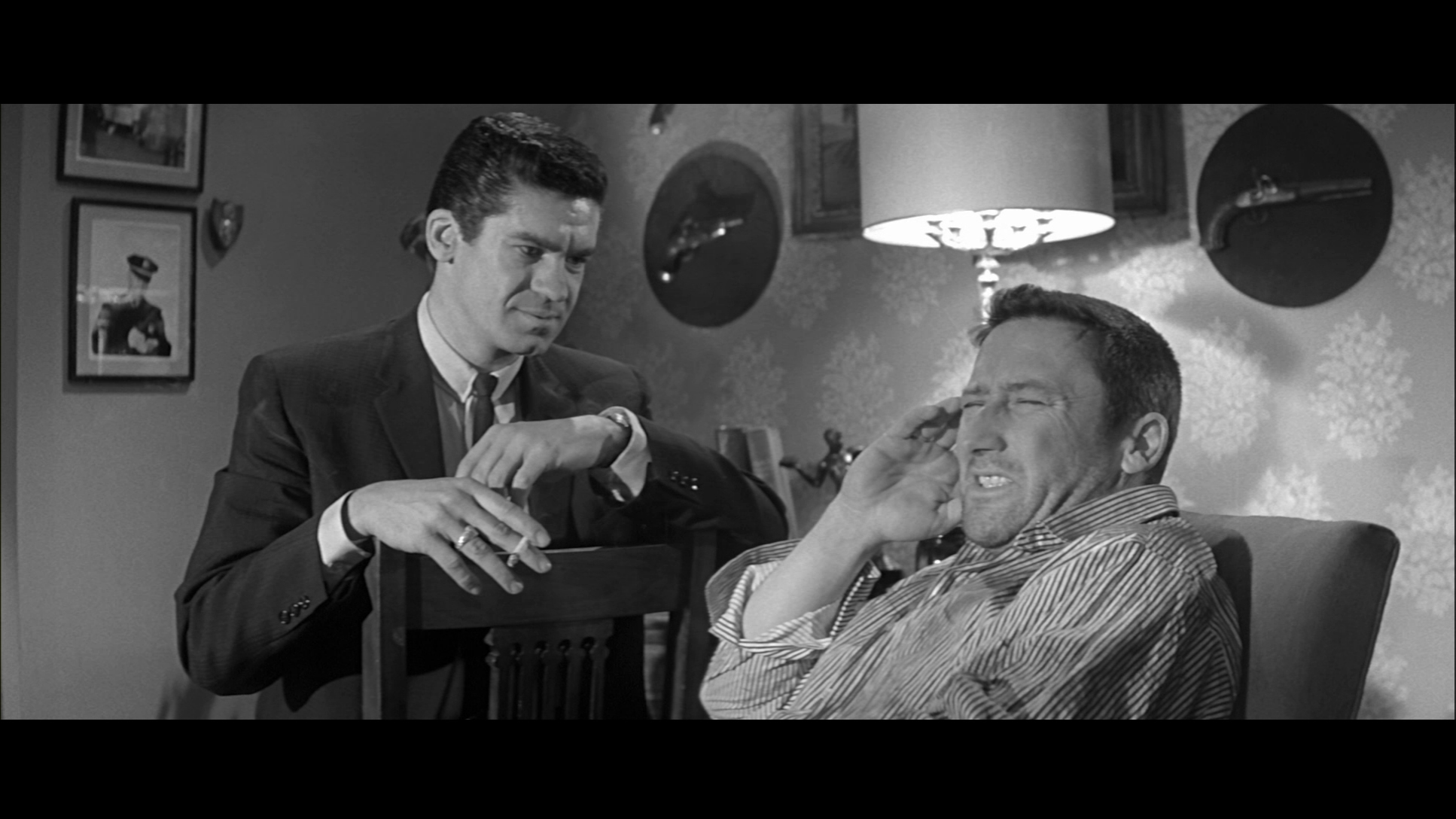 That brings us to 2014 with the Blu-ray and DVD reissue of the film from Scorpion Releasing, which receives the expected bump in quality courtesy of a fresh HD transfer. The inherent softness in some shots is due to the way the film was shot, but most of it is sharp and pristine with excellent, rich blacks. There's also a very informative, fact-packed commentary with mystery writer and Spillane collaborator/expert Max Allan Collins, who runs through Spillane's cultural influence, the history of Mike Hammer and all the film participants, and the tropes of crime TV, film and fiction during the period. The disc also packs in some surprisingly dense video extras including a great 30-minute interview with Spillane himself (conducted by Collins) about being asked to star in the British-Canadian production (where tea time brought each day's shooting to a halt until he brought in tea all day long), competing with the fledgling James Bond franchise, and several colorful anecdotes about cast members and bartenders. Then Eaton appears for a nine-minute interview (shot for a Hammer doc), still sporting that great twinkle in her eyes as she recalls working with writer (as opposed to "novelist!") Spillane as an actor and the madness of shooting this while appearing in the play Come Blow Your Horn at night. The theatrical trailer rounds out this unexpectedly robust edition of a bona fide crime film cult classic.