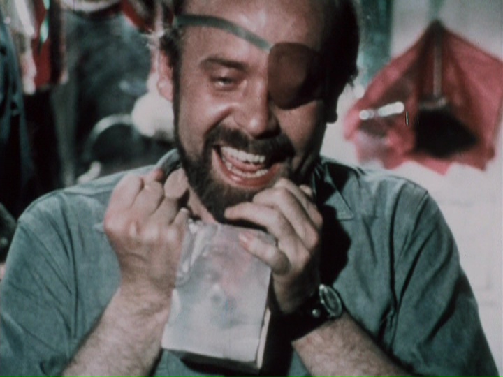In a particularly irrational plan to round up some rent money, starving artist Arthur Malcolm (Brundin) decides to break into a woman's apartment at night. Of course, she happens to be home and doesn't take kindly to having a stranger rifling through her purse, so she gouges out Arthur's eyeball with a handy spoon. Somehow he manages to crawl away before the cops arrive (with the same shriek looped on the soundtrack over and over), and afterwards he's tormented by visions of disembodied eyeballs hanging from a mobile on the ceiling. Now wearing an eye patch and keeping his poor little eyeball preserved in a