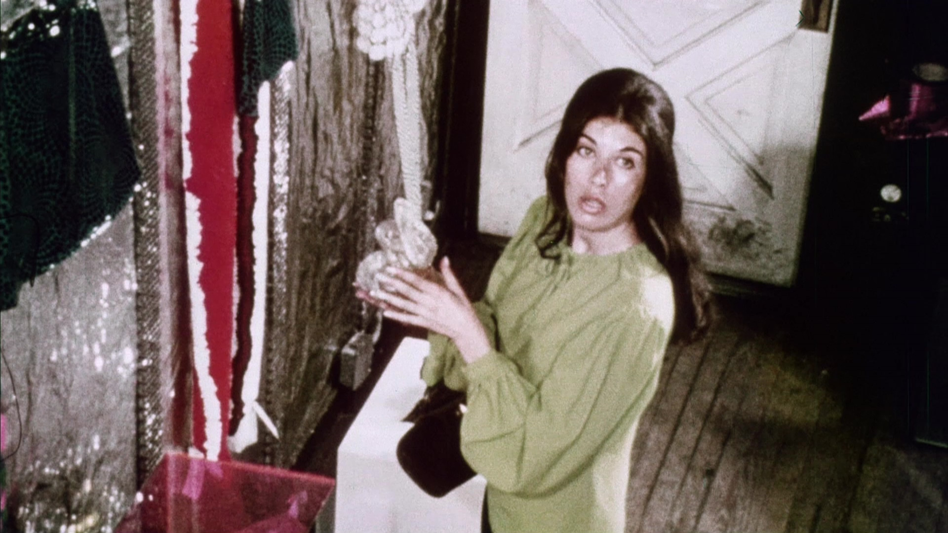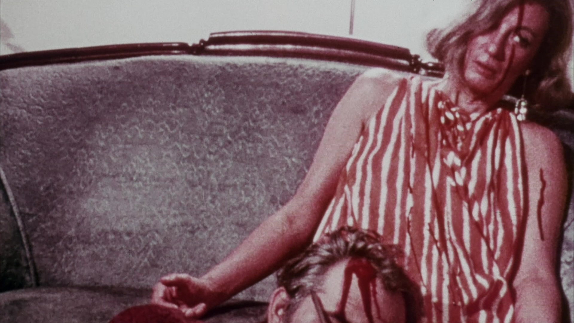 This was one screaming out for a fresh video scan after decades, and Code Red stepped up to the plate in 2016 with a Blu-ray offering two viewing options: a 1.78:1 widescreen version in HD and an open matte 1.33 one in SD. The widescreen one adds a bit to the right side while lopping a significant amount from the top and bottom, while looking a bit pinker as well. The grain is more detailed on the HD version with a tad more texture, but honestly you're fine with either option and may find the roomier compositions on the 1.33:1 one more than sufficient for your Headless Eyes needs. (Here's a sample frame grab.) The DTS-HD MA English mono audio sounds fine considering most of the film sounds like it was captured with a cheap tape recorder. The film can also be played with wraparound segments featuring hostess Katarina Leigh Waters in her "Antoinette's Sweet Dreams Theater" mode as her French twin sister, riffing on the film's "My eyes!" scream (which also plays in a loop on the menu, of course), and delivering various observations about the low-rent project before diving into some of the strangest closing credits you're likely to see.