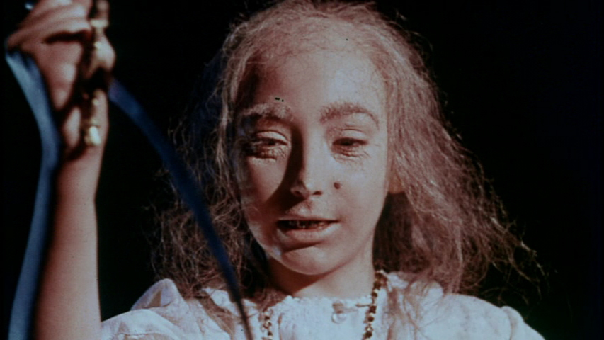 A fairly regular item on VHS from a number of below-the-radar labels (including one with great cover art), Demon Witch Child popped up on a few gray market compilations as well from the same early '80s video master. The Code Red version is obviously a much newer transfer from what appears to be a 35mm print that also passed through its share of projectors, but despite its ragged appearance at times, it's still better than what we had before. As usual this is the English dubbed version, which doesn't appear to have been trimmed in its journey from Spain to America. Thankfully all of the ridiculous profanity is kept intact, with Salgado hurling a few casual epithets at the priest that would've gotten Brett Ratner kicked out of Hollywood for good. Also included are "demonic" trailers for Seeds of Evil, Devil's Express, Heated Vengeance, House of Insane Women, and The Vampires' Night Orgy.
