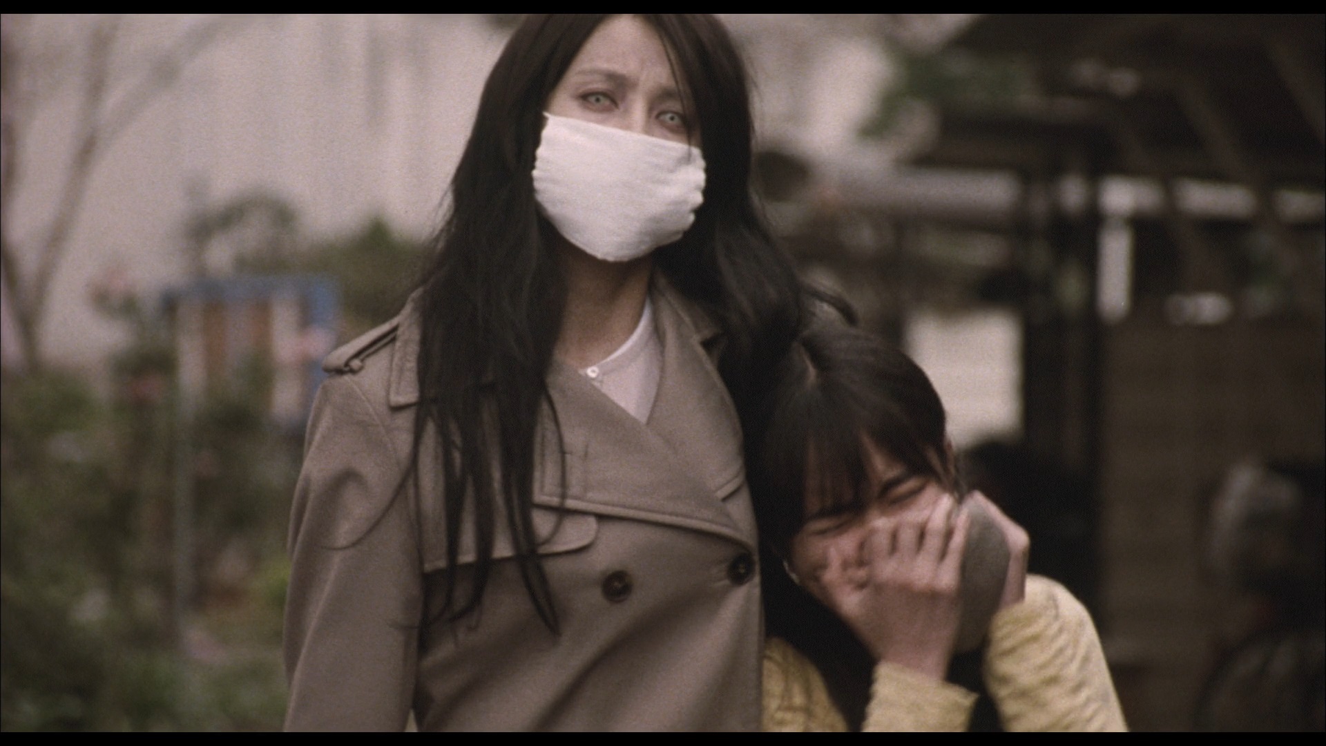Easily the most traditionally horrific film in the set and one of the best starting points for newbies arrives on disc three with Carved: The Slit-Mouthed Woman, an extrapolation of a familiar urban legend about a sinister masked woman who approaches strangers asking "Am I pretty?" and doling out mutilation, murder, or a pass depending on the answer. Made in 2007, it came along late in the golden era and delivers some ghoulish slasher-flavored thrills with a particularly intense and nightmarish twist on the unstoppable Japanese female specter. In this case, children are being kidnapped in a town where teacher Kyoko (Sato) is dealing with her own custody arrangement with her daughter. She and fellow teacher Noboru (Kato) start