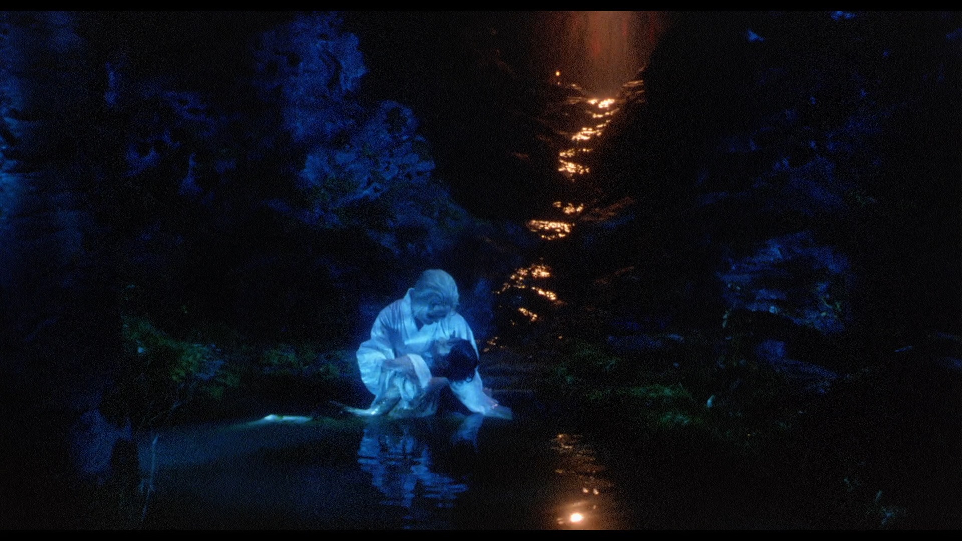also correct the black levels to the intended deep, rich look that's been largely absent before. As with all but one of the other titles in this Blu-ray set, they each have DTS-HD MA 5.1 and 2.0 Japanese mixes with optional English subtitles. Each features a new audio commentary as well; the always reliable Tom Mes does the honors for Shikoku, breaking down its cultural references, the history of the locale, and the film's place in the first wave of J-horror, among other subjects. Then Jasper Sharp and Amber T. join forces for an in-depth and rewarding dive into Isola talking about the earthquake, the merging of psychic and ghost story tropes, connections to other genre films around that time, and the relationship between theatrical and home video audiences. In "The Aftermath" (23m53s), Mes explains how the J-horror boom rose out of the 1990s home video market when Toho dominated the local theatrical market, with horror proving to be an affordable and effective way of tapping into social anxieties and folklore in a way that resonated far and wide. "Something in the Water" (22m54s) is a new interview with Shikoku's Nagasaki about how he approached layering the film's narrative secrets, the decision to shoot on location in the titular location after finding just the right village, and the process of organizing the shoot. Ported over from earlier editions are short archive interviews with Nagasaki (3m47s) and actors Chiaki Kuriyama (2m15s) and Yui Natsukawa (3m34s), while Isola has archive interviews with actors Yoshino Kimura (1m44s) and Yu Kurosawa (1m32s). Then you get some raw production footage of the filming of Shikoku (3m27s) and Isola (2m45s), a trailer for Isola paired with Ring 0, and a Shikoku trailer (paired with Ring 2) and two TV spots plus image galleries for both films.