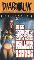 Killer Barbys made its U.S. debut on DVD from Shriek Show with either Spanish or English-dubbed options (the latter pretty much unlistenable, not to mention confusing since tiny bits of the film were shot in actual English) with optional English subtitles, talent bios, a Billy King and Silva Superstar interview (13m23s) in heavily accented English about their music careers and playing with the Misfits, a "Barb Wire Babies" text essay, "Mars" and "Downtown" music videos, bonus trailers (Eaten Alive, Burial Ground, Jungle Holocaust, Beyond the Darkness), a lobby card gallery, and "Talking with Killer Barbys" (19m59s), essentially a selected scene commentary over highlights from the film. The PAL-sourced transfer runs a bit fast at 87m2s and looks pretty awful, with lots of motion blurring, cropping, severe vertical squeezing... it's just a mess.
