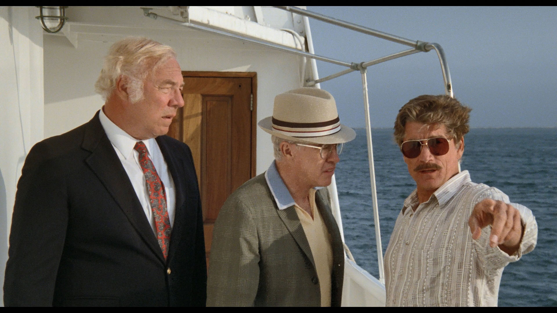 At a scientific research facility, a cute orange kitty manages to escape despite being hit with a tranquilizer gun and even pops a rubbery monster out of its mouth to take out one of the security guards. Meanwhile Bobbie (Carey) and Suzanne (Shattuck), who are out looking for some spring break fun, end up crossing paths with slick wheeler dealer "Wall Street Walter" Graham (The Dead Are Alive's Cord) who talks them into having dinner. Their meal ends up being crashed by two of Walter's associates, George (Death Ship's Kennedy) and Albert (Return of the Living Dead's Gulager), to continue a shady deal culminating with them drowning a possible informant to the SEC. That also means they have to hightail it to the nearest port in Ft. Lauderdale to catch a private luxury liner to the Cayman Islands to stash two briefcases of their illicit money, with both young ladies in tow for cover along with three of their buddies, Corey