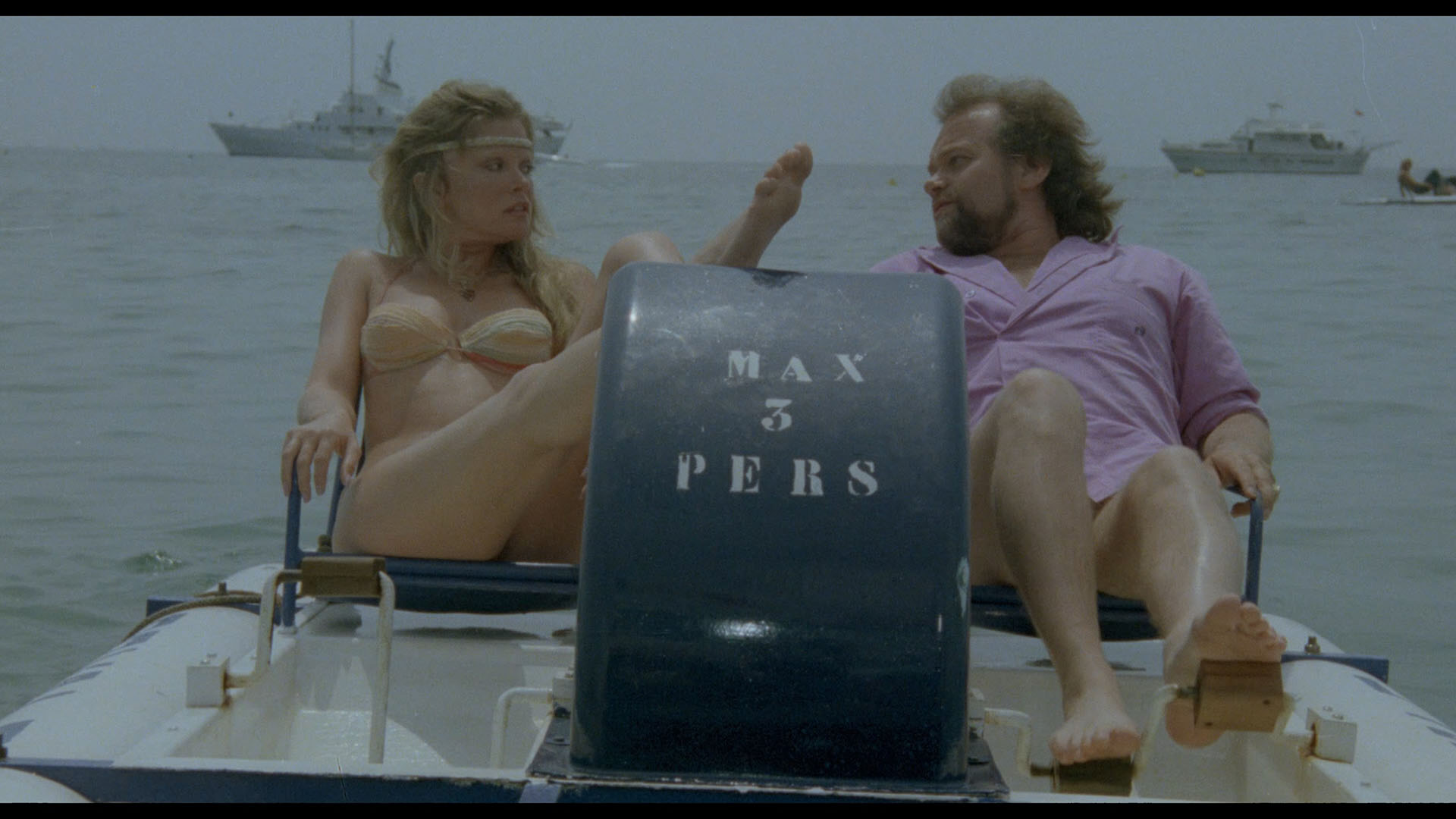 reflexive look at horror idol worship and the superficial allure of movie making in general gives it all a distinctly different flavor. Of course, Munro is always worth watching and looks great with her gray-streaked hairstyle, not to mention a show-stopping scene in which she's terrorized and chased from her hotel room in nothing but a towel (which the awaiting press thinks is an elaborate publicity stunt). If that weren't enough, the film is also a delicious early '80s time capsule, kicking off with Depeche Mode's "Photographic" blasting over the opening titles and peppering the entire running time with great on-location Cannes footage promoting the likes of For Your Eyes Only, First Blood, The French Lieutenant's Woman, Cannibal Holocaust, Robert Benton's Stab before it became Still of the Night, and Andrzej Zulawski's Possession, for which a briefly-glimpsed Isabelle Adjani actually did garner an award for appearing in a horror film along with a more traditional Merchant-Ivory film the same year, Quartet. Of course, the obligatory Côte d'Azur topless sunbathers are thrown in for good measure, too, along with brief celebrity sightings ranging from Marcello Mastroianni to Cathy Lee Crosby.