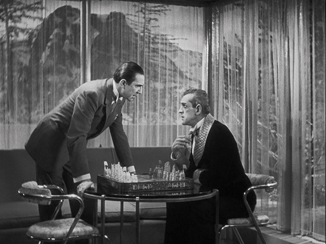 or two. Suffused with the pain and dread of World War I as well as the public’s fascination with the dark antics of Aleister Crowley (and completely devoid of anything connected to Edgar Allan Poe), the story begins with two newlyweds, thriller writer Peter (Manners) and his wife Joan (Wells), sharing a train ride with Vitus Werdegast (Lugosi), a Hungarian psychologist and former solider recently released after years in prison. Werdegast is now on a mission to track down his missing wife and daughter as well as seek a confrontation with Hjalmar Poelzig (Karloff), who betrayed Werdegast’s platoon and has now built an ultra-modernist house on the site of the massacre. Following a vehicular accident, Werdegast and the couple end up at Poelzig’s fortress where they become entangled in a web of shocking secrets and devil worship.