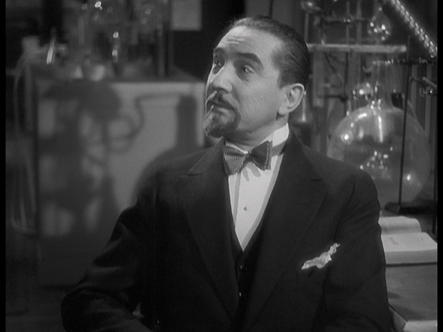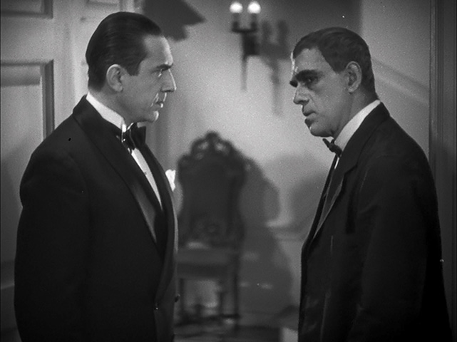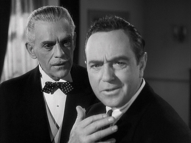 would indulge in with Monogram Pictures and other quickie indies. That’s hardly a flaw though as it particularly allows Lugosi to gnash the scenery with gusto, and Karloff’s ghoulish appearance also goes a long way to establishing a tension between the two men that pays off during the lively,