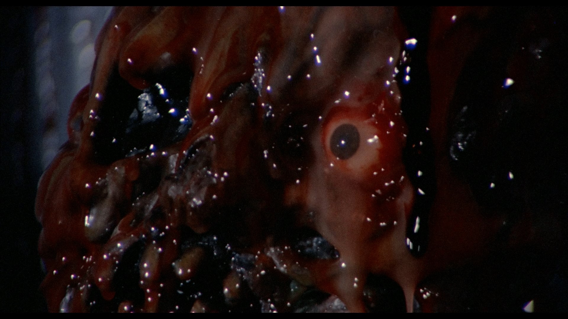 part of a noble attempt to keep the drive-in monster movie tradition alive when it opened in December of 1977, closing out a run that year including Empire of the Ants, The People That Time Forgot, The Island of Dr. Moreau, and Tentacles. The cheapest of the bunch and completely lacking in star power, it compensated by focusing on its title character, a memorably drippy creation from a young Rick Baker just after his work on the big studio redo of King Kong. In fact, Baker became the main focus of one of the film's trailers, a rare feat for a makeup artist and a sign of major things to come when he became the first competitive Oscar winner for makeup for 1981's An American Werewolf in London. As for the film itself, it's essentially a cinematic link in the "astronaut comes back with monstrous surprise" tradition between The Quatermass Xperiment and Lifeforce, with a peculiar personality of its own courtesy of some outrageous touches from director William Sachs (Galaxina, Van Nuys Blvd.).