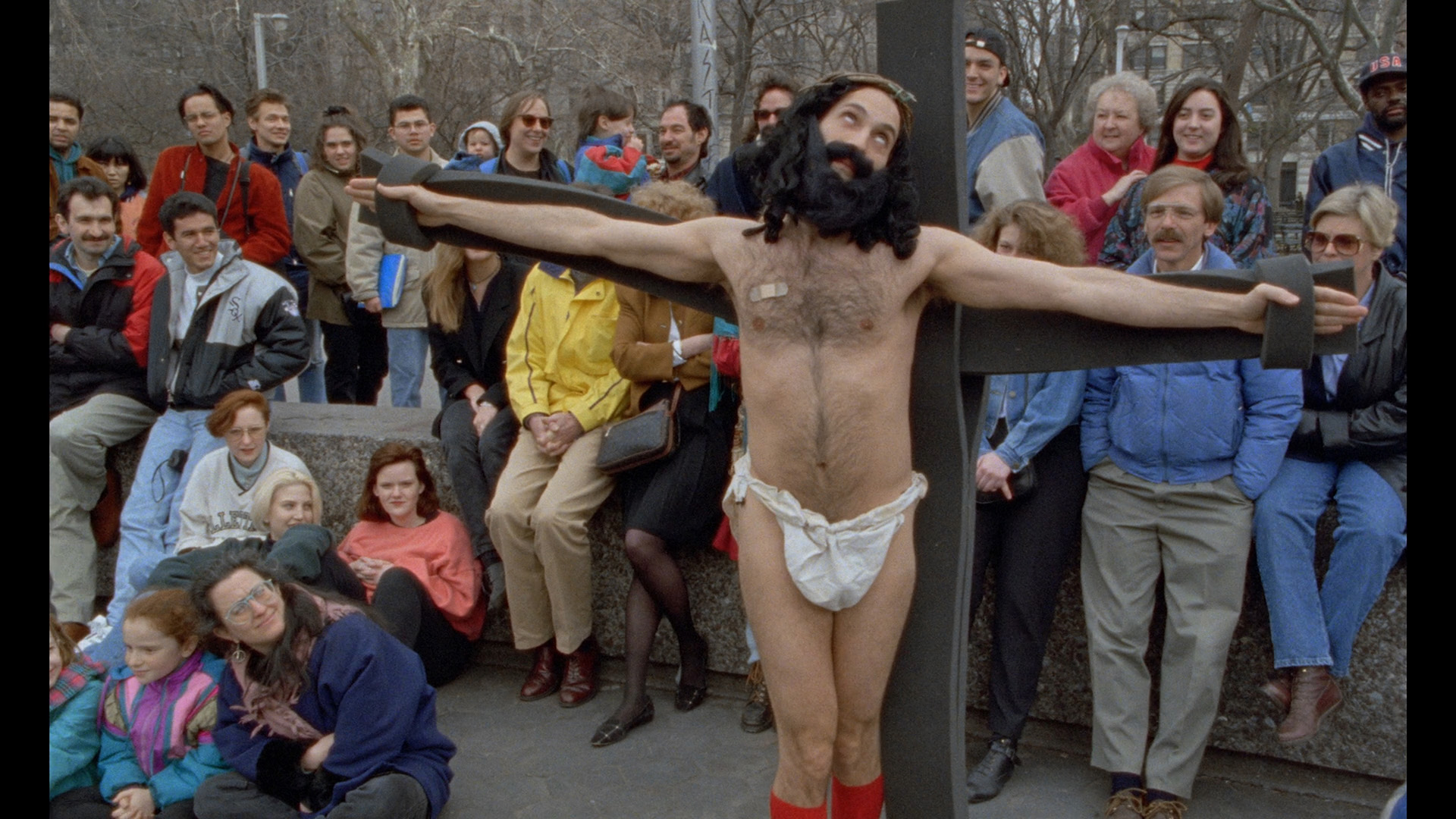 Then we get to the group's move to shooting a bona fide theatrical feature on 16mm, Cracking Up, which is understandably shot and performed with a lot more polish. Mitler stars, directs, edits and co-writes here for a freewheeling character study of stand-up comic Danny Gold, a manic member of the Manhattan club scene. Possessing a serious self-destructive streak, he tries to embark on a couple of romantic relationships and seems to be moving up thanks to a new agent -- but his penchant for drugs, self-absorbed behavior, and general dickishness keep tripping him up. The real treat here is seeing a stylized recreation of the Lower East Side comedy club scene in the mid-'90s, here rendered as a kind of jacked-up pit of insanity that culminates in a memorable climax Mitler really commits to right down to his haircut. The opening sequence featuring a bizarre riff on On the Waterfront will let you know very quickly what you're in for, and the lengthy outdoor sequence with Mitler doing surreal mime and Jesus routines for a bemused crowd really has to be seen to be believed.