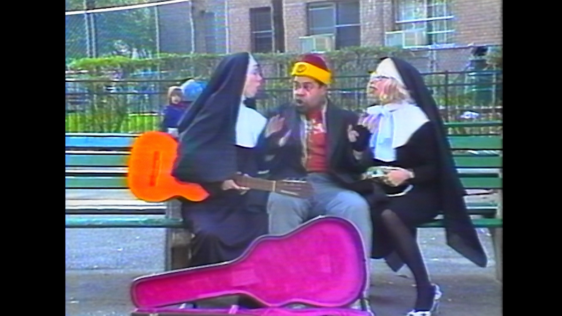 Christ (45m1s) has really rough audio, but it's an amusing, very John Waters-style look at a couple of women whose friendship and plans for an upcoming wedding are disrupted by a major life course change. Complete with a bit of nunsploitation, a Jesus cameo, and the sight of busking nuns in the middle of New York, this one doesn't overstay its welcome and gets nuttier as it goes along. Les Enfants Miserables (51m15s) features Nancy Fichman, Mitler, and McDermott