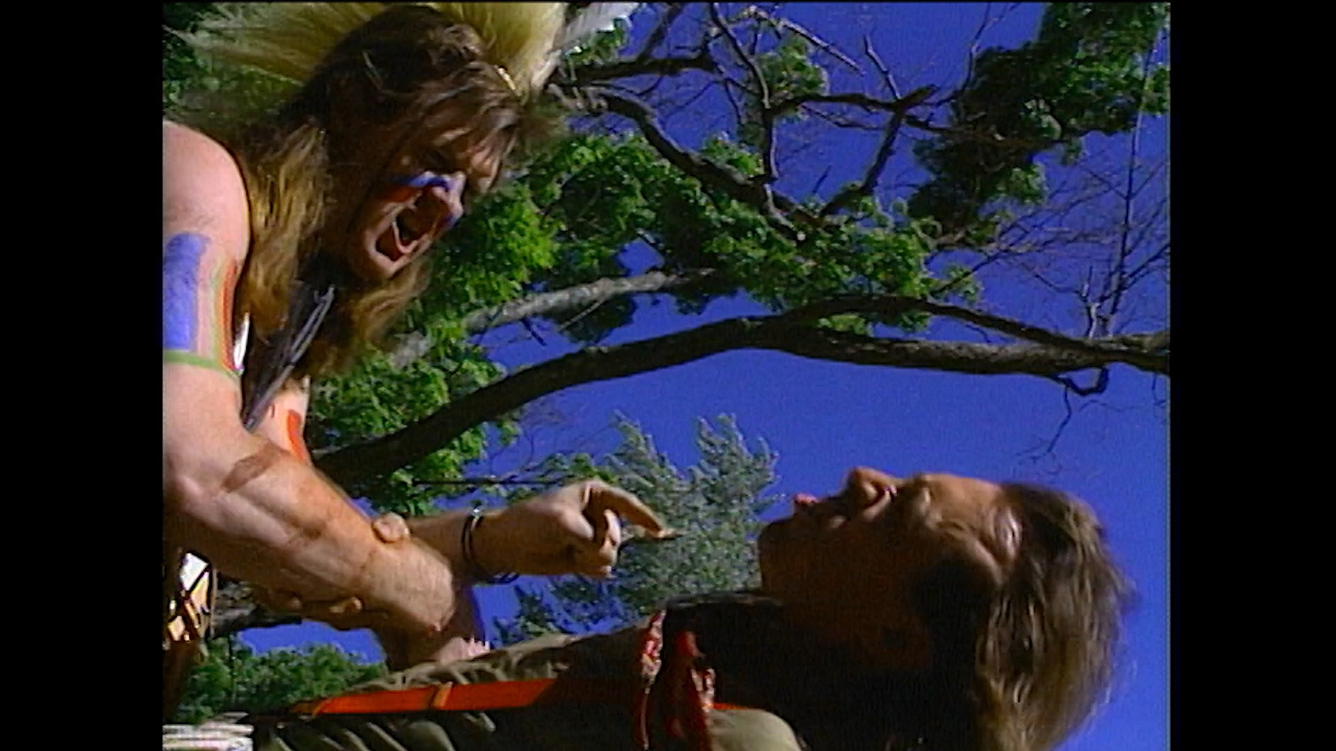 Disc two kicks off with the Surf Reality outlier Macbeth, King of Scoutland (97m39s), which was obviously shot in more than one day and adapts a very silly stage production by the gang adapting William Shakespeare's immortal tragedy into a farcical power struggle among some scouts in the woods. Here the three witches are played by guys in grass skirts and mop wigs, Lady Macbeth is a Girl Scout hopping around with a jump rope, and everyone has a different accent (none of them Scottish). Also on the disc is the recently completed Turf of Savage Homicides (35m3s), which sat incomplete for decades apparently and serves as a showcase for Mitler as a nightmare-plagued, soft-spoken delivery guy who's weirdly nonchalant about the fact that he's being regularly tortured by a couple of guys behind a doctor's office. Then things get weird. Also on disc two are all the bonus features starting with a new reading of an excerpt from Mitler's "Ten Commandments of Low-Budget Production" (6m33s) about his lessons learned after getting started doing 8mm shorts. Then you get a shooting locations tour (12m13s) with Mitler and Prichard, a trailer for Cracking Up, and a huge batch of interviews with Mitler (16m4s), Prichard (4m33s), Jennifer Babtist (7m22s), Chuck Montgomery (3m24s), Jeff Eyres (44m10s), Kiki Flynn (6m45s), Jason Brill (5m25s), Debra Kaplan (4m25s), Dale Goodsen (4m59s), Bob Sikoryak (4m4s), Julia
