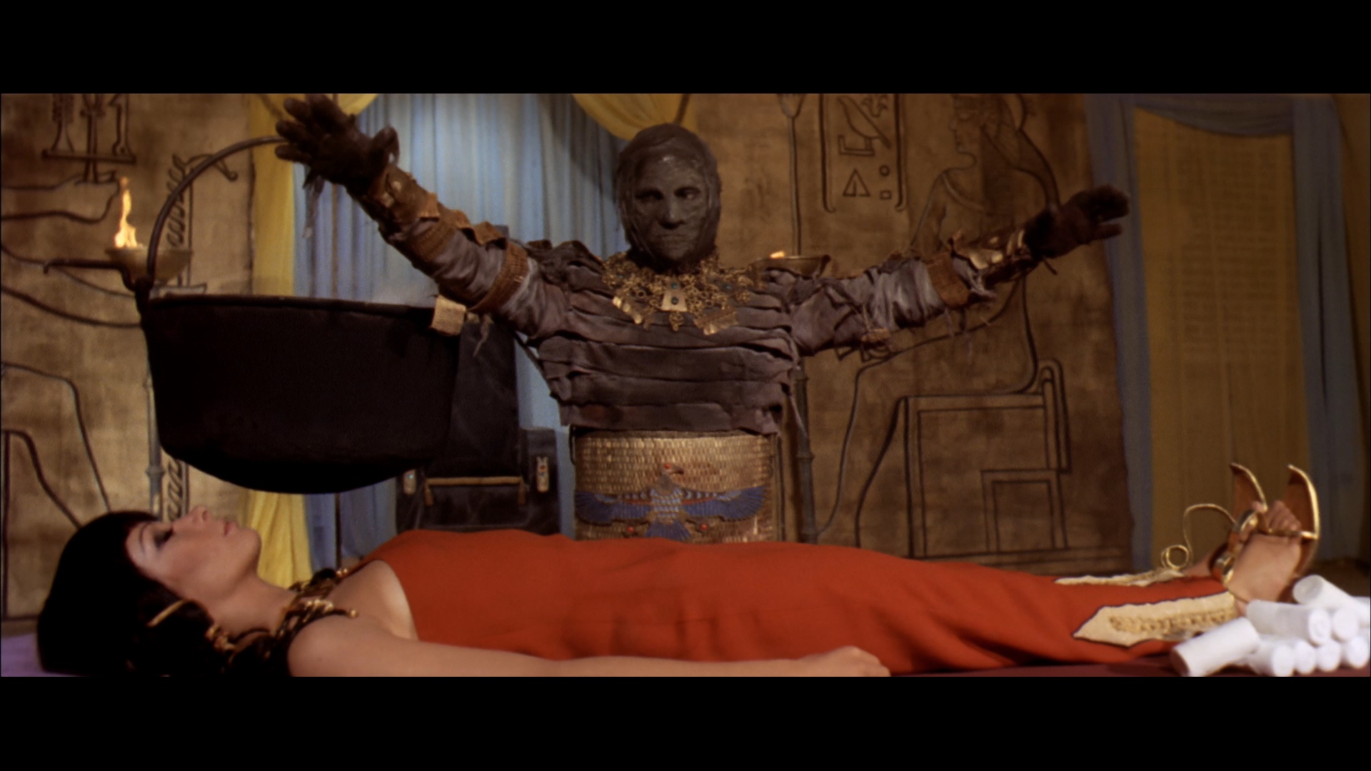 options) for the standard Spanish edition, running at PAL speed of course. The 2019 Blu-ray edition from Scorpion Releasing offers two versions; it was common practice to shoot Spanish horror films in clothed and unclothed versions for the respective Spanish and international markets, and while that may have been the case here during production, some scenes that would seem to be unclothed candidates have never materialized. However, one scene involving the mummy crashing in on a pair of newlyweds around the 41-minute mark is missing from the Spanish version, so you get the option of watching either cut on this disc. The longer version is a composite mostly from the excellent HD scan of the Spanish source with a lower quality one sourced for the extra bit, viewable in either Spanish or English DTS-HD MA mono tracks. The Spanish track is quite a bit more robust than the English one (which his pretty flat and has an on and off fluttering noise), so that default is preferable unless you really love that English dub (which is understandable with all the extra goofy mummy sound effects). The English subtitles are accurately translated from the Spanish track, so it's also fun to see how it compares to the English dub throughout. The slightly shorter English theatrical cut is also offered in pristine quality all the way through, albeit only with the inferior English dub (so you can basically skip it).