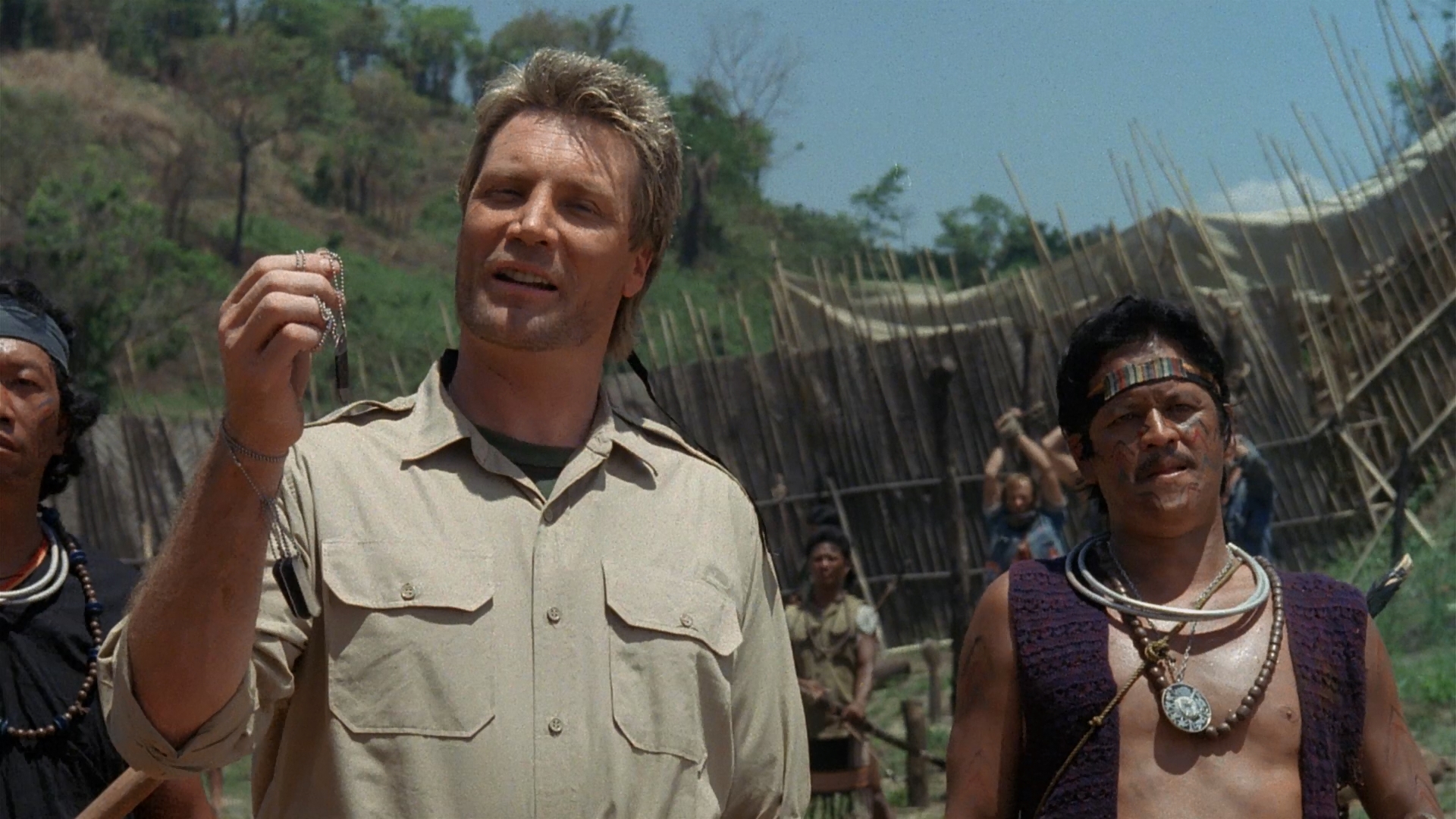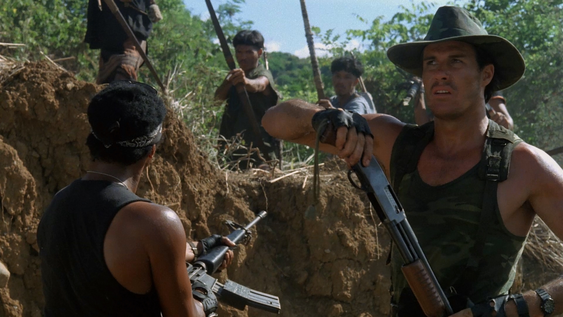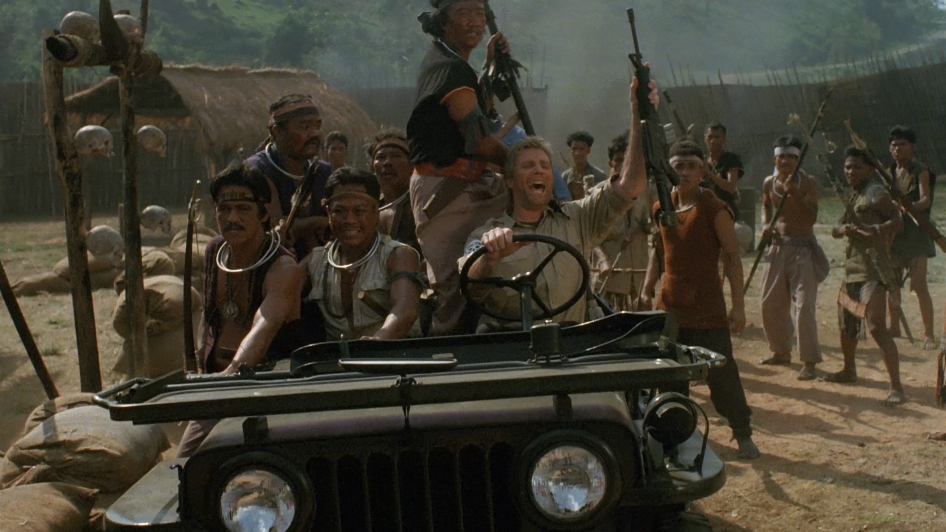 Basically another riff on Rambo: First Blood Part II but with a crazed twist, our story finds clean-cut American Lieutenant Calhoun (Johnson) tasked with bringing home a couple of P.O.W.s from his regiment who were captured during an ambush by a crazed white mercenary named Chard (The Road Warrior's Wells). Now the missing men are in one of the deepest, darkest, most dangerous areas of Vietnam, so Calhoun