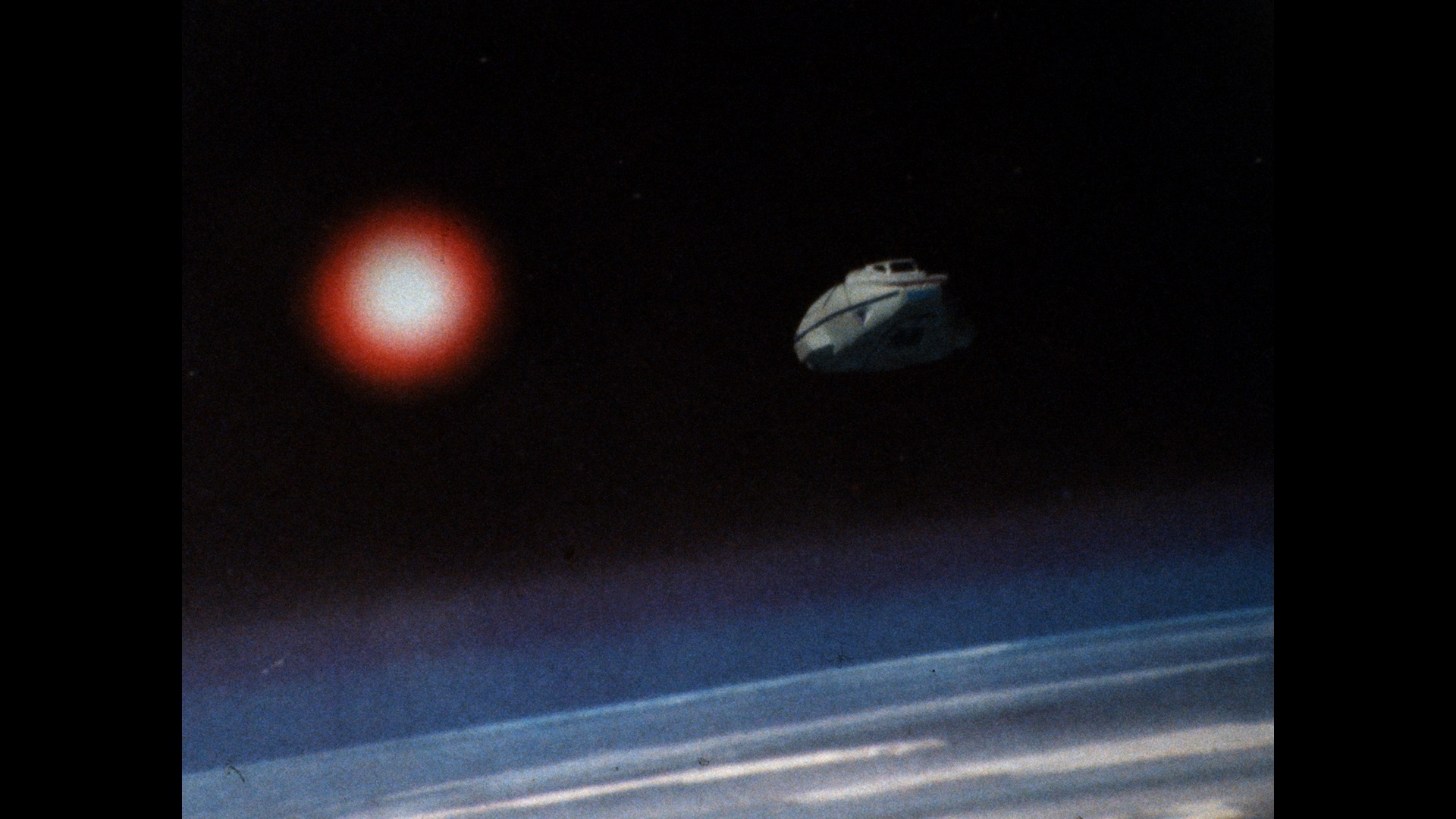 leads until he was handed the script. He also explains how his theater training had to be modulated in front of the camera and how his motorcycle suit ended up being integrated in an unorthodox way for the shoot. "Crashing the Set" (14m31s) with visual effects artist John Ellis covers the basics of the trickery involved in bringing the film's space effects to life (including the judicious use of pennies) and also touches on the on and off relationship he had with the director, which seemed to hit a snag on every film. Extra points for the funny integration of the label's name, too. Finally in "Shooting the Nightbeast" (19m4s), cinematographer (and brief actor) Richard Geiwitz explains how he became captivated with the many aspects of cinematography via Super 8 films and got his shot at feature films through Dohler and his Cinemagic magazine. In particular he explains how his work on Fiend paved the way for his approach to this film with a more dynamic mixture of settings and camera movement. The (absolutely amazing) theatrical trailer is also included along with a great behind-the-scenes visual effects gallery (4m16s).