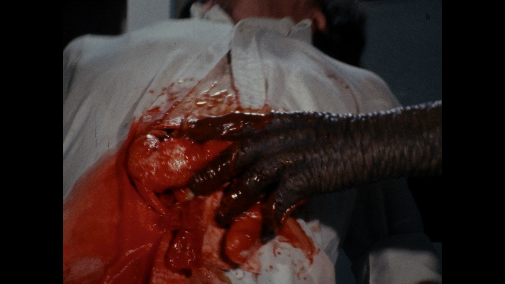 Initially released on VHS by Paragon, Nightbeast made its DVD bow in 2004 from Troma (who snagged the rights in the early '90s) in a fairly stacked edition featuring an audio commentary with Dohler and actor George Stover, a reel of outtakes and bloopers, and the usual Lloyd Kaufman filler material. In 2019, the film made its Blu-ray bow from Vinegar Syndrome as a dual-format release timed for the annual Halfway to Black Friday sale including a limited slipcover edition. The new 2K scan from the 16mm camera original looks fantastic and easily surpasses its video forebears in every way; blacks in particular are a lot richer and deeper here, while the frequent bursts of red blood and laser blasts look especially impressive. However, the drastic increase in resolution might not be such a welcome thing during the big sex scene, so brace yourself. The DTS-HD MA English mono track is also in much better shape with the droning electronic score sounding less sludgy than before here; optional English SDH subtitles are also included. The commentary (which is fine and sometimes really informative but ultimately a little flat) is ported over here along with the outtakes and bloopers (6m40s). "Night Beast Returns" (25m9s) edits together archival cast and crew interviews (with Dohler, Stover, Leifert, Abrams, Dohler's son Greg, and Kim Pfeiffer) about the origins of the film, the disastrous original attempt to make the film without Dohler directing, and the scaled-down result that ended up going in front of the cameras with a "student film" sensibility. Originally shot for the Dohler doc Blood, Boobs & Beast by John Kinhart, it's a great thumbnail account of the film's evolutionary process.