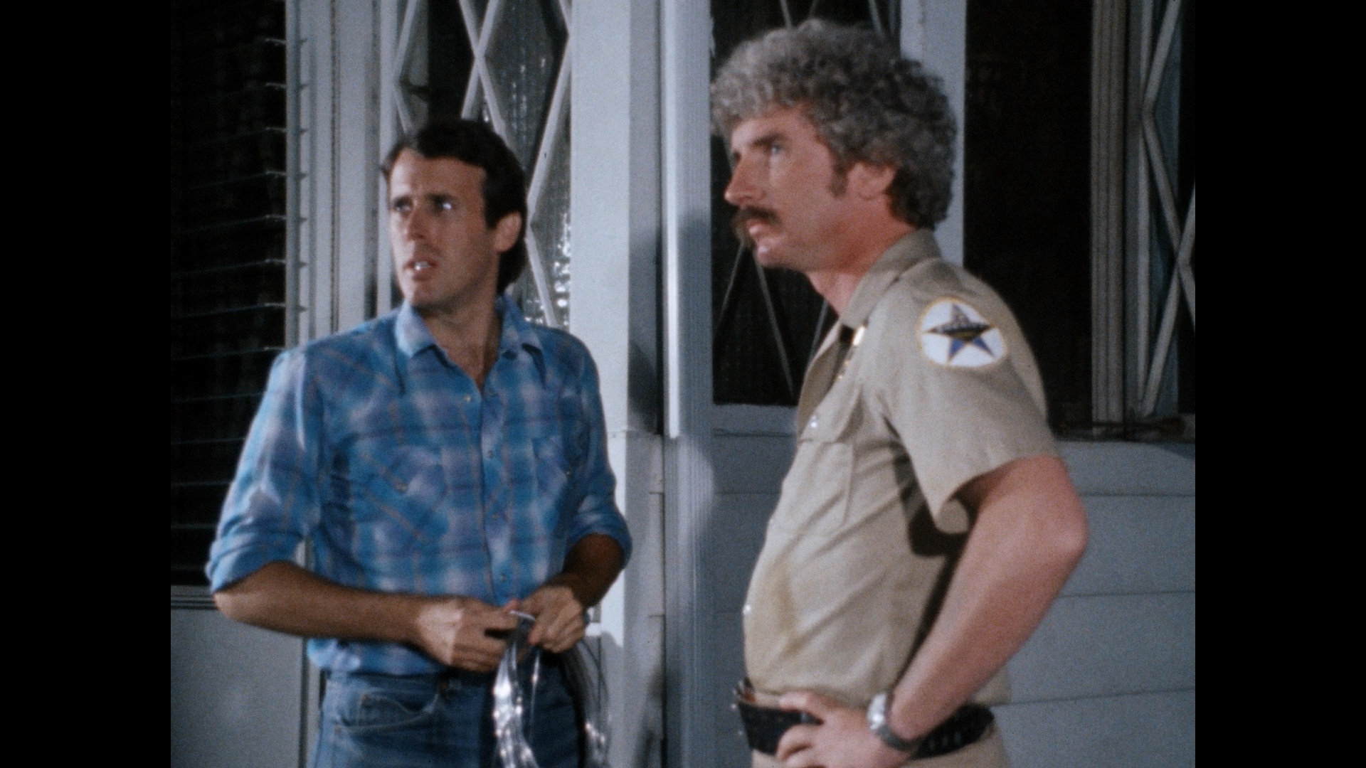 More or less rehashing The Alien Factor with many of the same cast members, our tale begins with a spaceship being felled by a passing asteroid and crashing into a forest in the middle of the night. Emerging from the wreckage is a shadowy beast on two legs, and as soon as it encounters a pair of yokel hunters, it blasts them into sparkly oblivion with its ray gun. The interstellar assault continues as it works its way through the nearby populace and proves impervious to gunfire, with fluffy-haired Sheriff Jack Cinder (Griffith) attempting to clear the town before the casualties get out of control. In the process he teams