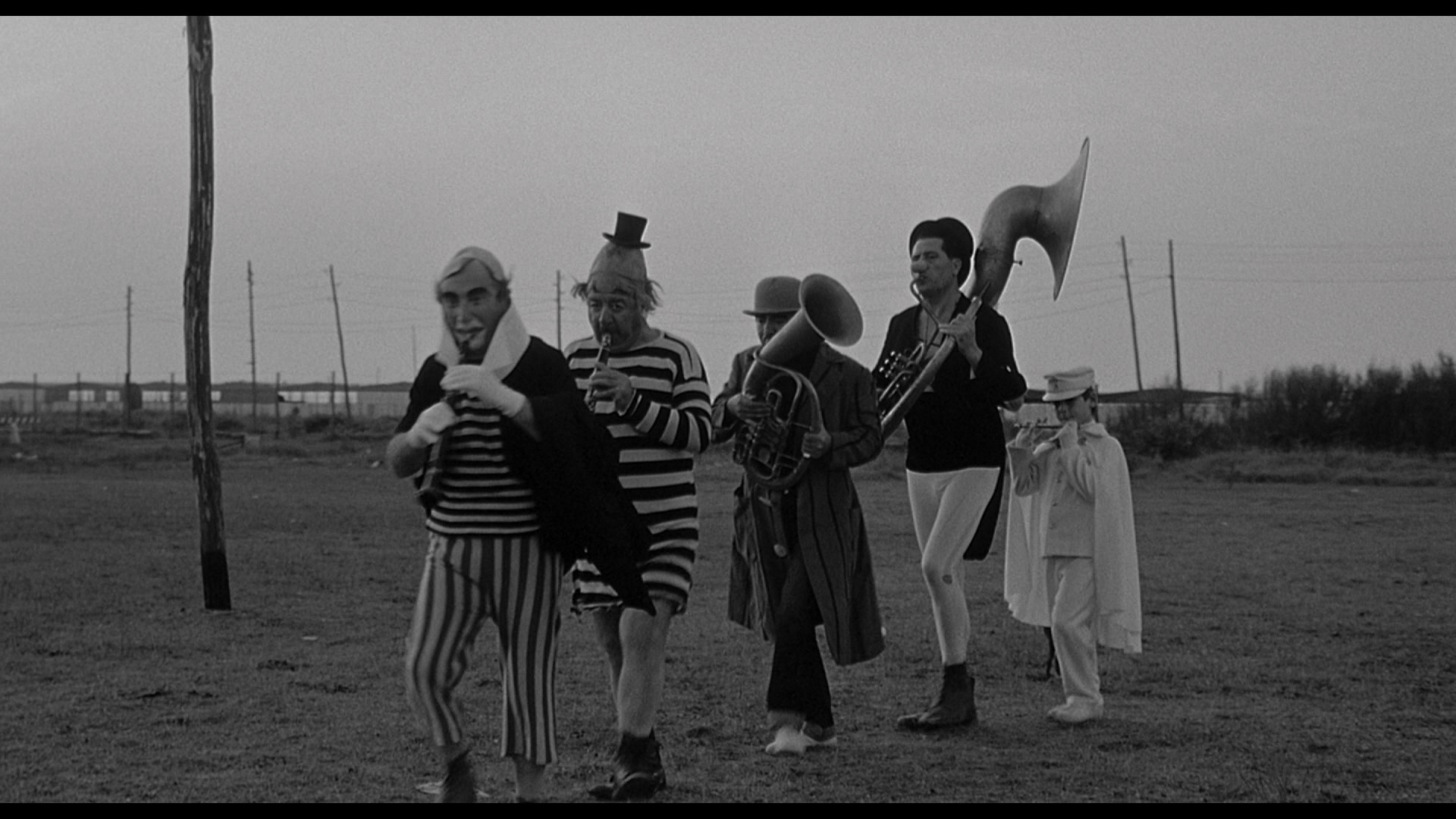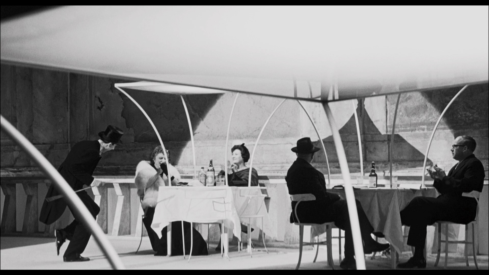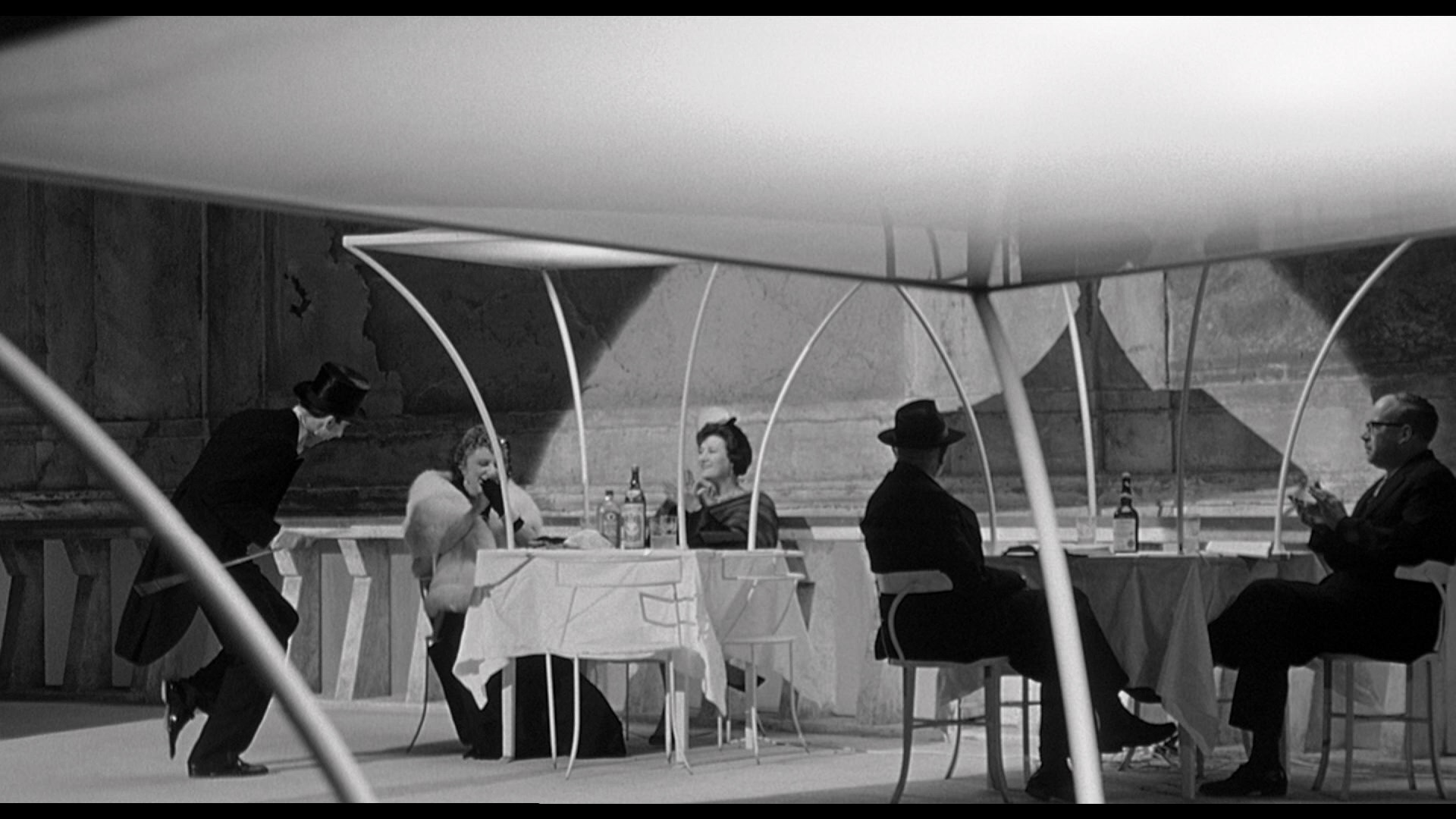Tribute" (1m16s), a quick text homage including the copy from his Honorary Oscar acceptance speech, and "The Lost Ending," the same featurette as the Criterion's "The Last Sequence." The feature itself is culled from what appears to be the same transfer as the Criterion. In 2020, Cult Films (essentially the much more productive arthouse rebirth of Argent) reissued the film on Blu-ray, porting over both "The Lost Ending" and "Fellini Tribute." However, you also get a new interview with Milo, "A Charming Spirit" (38m39s), which is a more in-depth recollection of Fellini from their first meeting at Fregene to the audition process and on to the circus-like atmosphere of the production, as well as her own take on Fellini's portrayals of women. Then "An Extremely Beautiful View" (16m9s) is a new, different Wertmüller interview about her memories of Fellini and Mastroianni, working as an assistant director to the consternation of a lot of women who wanted direct contact with Fellini, and finding the definition of a script operating a bit different than you'd expect in that environment. However, the big selling point here is the fact that this is a different transfer from the Criterion with quite a bit of additional info on the sides, particularly the top; it makes a significant difference as the actors' foreheads no longer scrape against the top of the frame, and overall it makes for more pleasing compositions throughout. It's also brighter and hotter looking by comparison, and textures look a bit more detailed by comparison on hair and clothing. (Frame grabs in the body of this review are from the Cult Films edition; comparison ones can be seen below.) The LPCM Italian mono track (with optional English subtitles as usual) sounds solid and is comparable to prior editions.