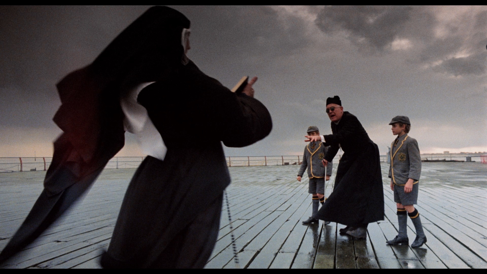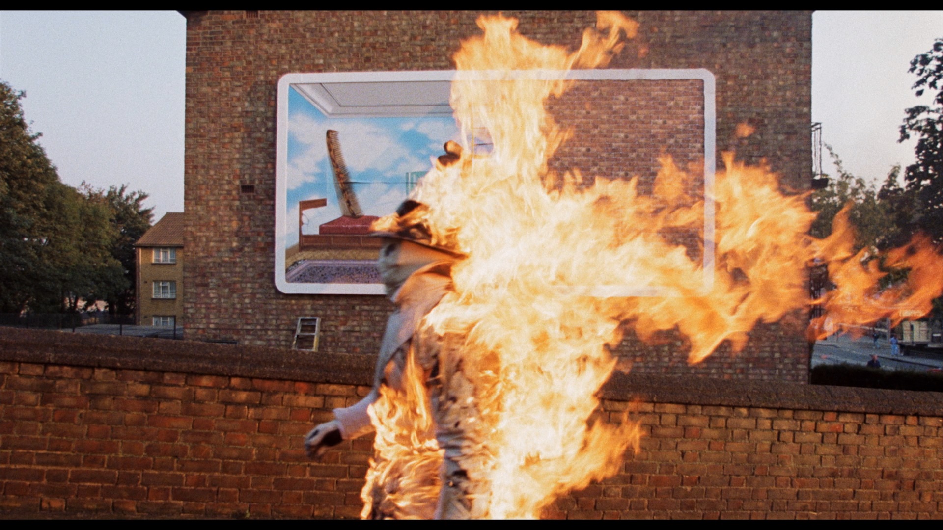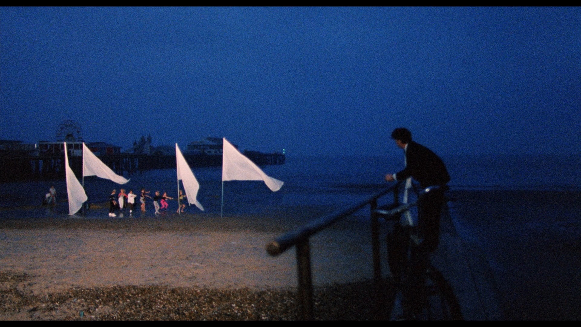 Long out of circulation in any format, It Couldn't Happen Here looks astonishing in its new presentation from the BFI as a dual-format Blu-ray and DVD edition, touted as a new 4K restoration. Anyone familiar with the somewhat gauzy and pallid old master from the late '80s will be shocked at how fresh and vibrant it looks here, with colors popping out splendidly. Just take a look at the "What Have I Done to Deserve This" sequence with Neil inside a blood-red phone box (which eventually leads to some real stage blood); it really pops off the screen and just looks beautiful. The LPCM 2.0 track (with optional English subtitles, some of which have some slight goofs in the song lyrics) also sounds superb and decodes nicely to replicate the original Dolby Digital Surround mix including some very enveloping rear channel effects, such as the sudden plane attack during "Two Divided by Zero" and the explosions before the final scene. A new audio commentary features Bond, art director James Dillon, and lighting cameraman Simon Archer running through the production of the film including the technical challenges of several scenes, the achieving of one memorable moment thanks to some fleet Steadicam work, the location scouting around Clacton-on-Sea, the wrangling over how many songs to get into the film, and plenty more. Don't expect any revelations about what it all means, of course, but as a production account it's priceless. In the video interview "West End Boy" (27m4s), Bond returns for a more expansive overview of his career, why he took on this feature, and the methods from his past work that came in handy here. In "It Can Happen Here" (25m35s), choreographer Arlene Phillips goes over the highlights of her long and illustrious dance career as well as the skill she had to bring to some of the film's dance sequences, which are indeed pretty impressive (and anticipate several films by Baz Luhrmann). An earlier unseen version of the film is presented in script form (under the title Actually, not surprisingly), and you also get a digital reconstruction of the theatrical trailer in HD. The familiar "Always on My Mind" music video is presented here in its entire lo-fi glory here as well along with a section of image galleries, "As It Happened," covering the final script, shot lists, lyric shots, and promotional material including various video releases and marketing odds and ends. Though it sold out quickly, a limited edition was also released featuring deluxe packaging and a booklet.